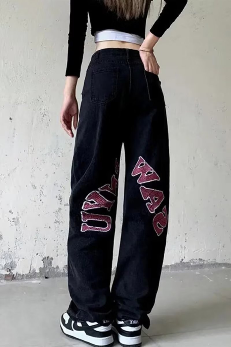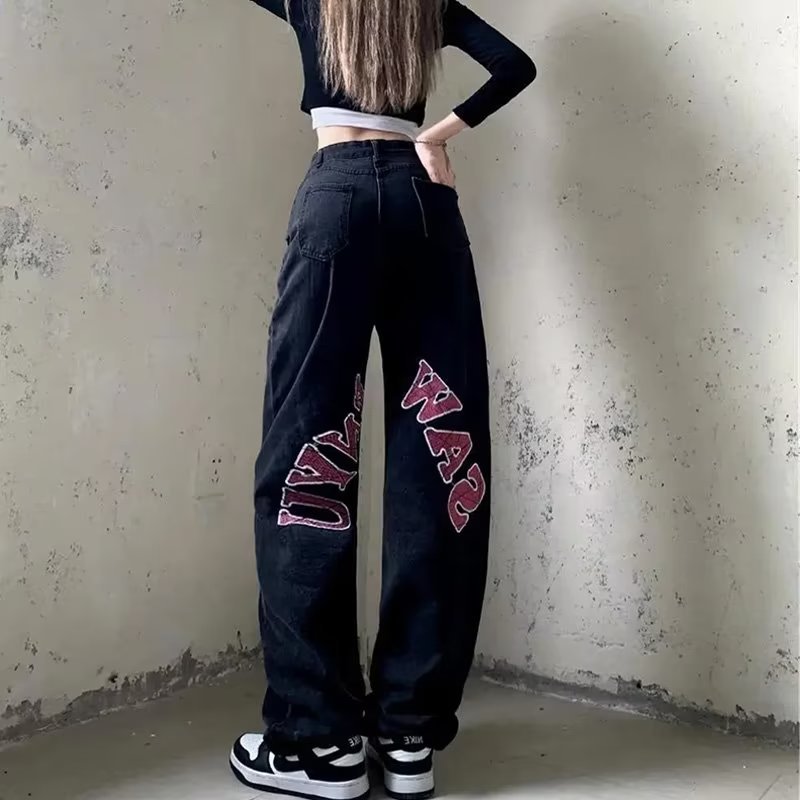 | nameOriginal | European and American style black printed jeans women's new high waist loose slimming wide leg straight long pants vibe High Street |