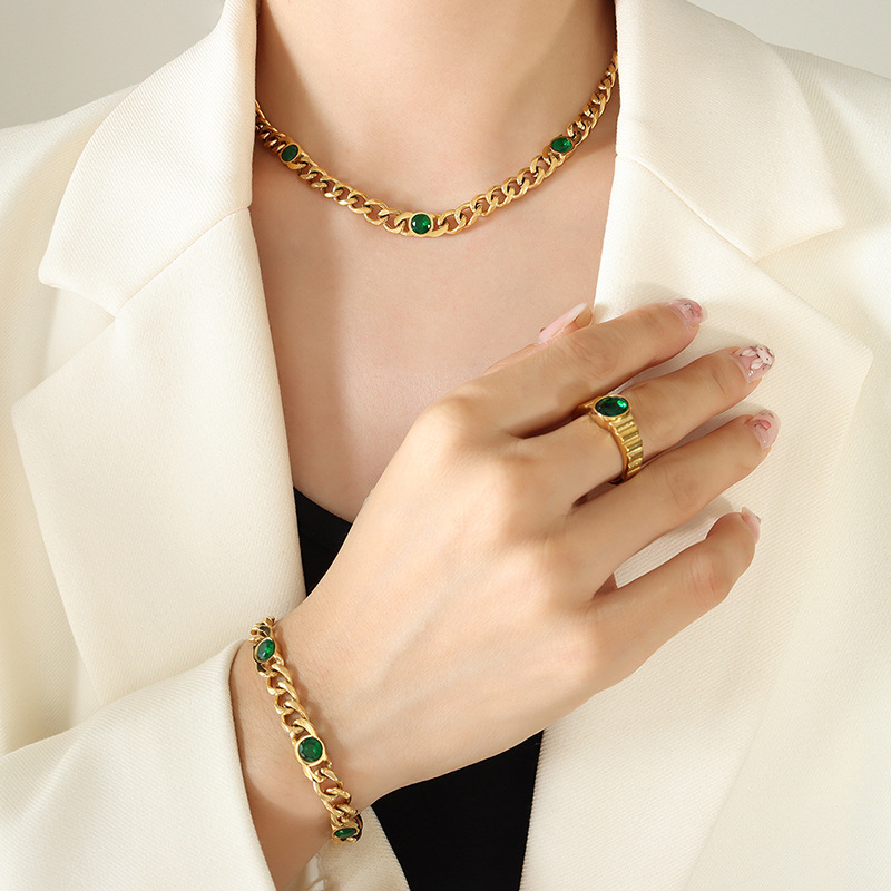 | nameOriginal | European and American style choker simple titanium steel gold plated Cuban chain inlaid with white green zircon bracelet necklace jewelry set |