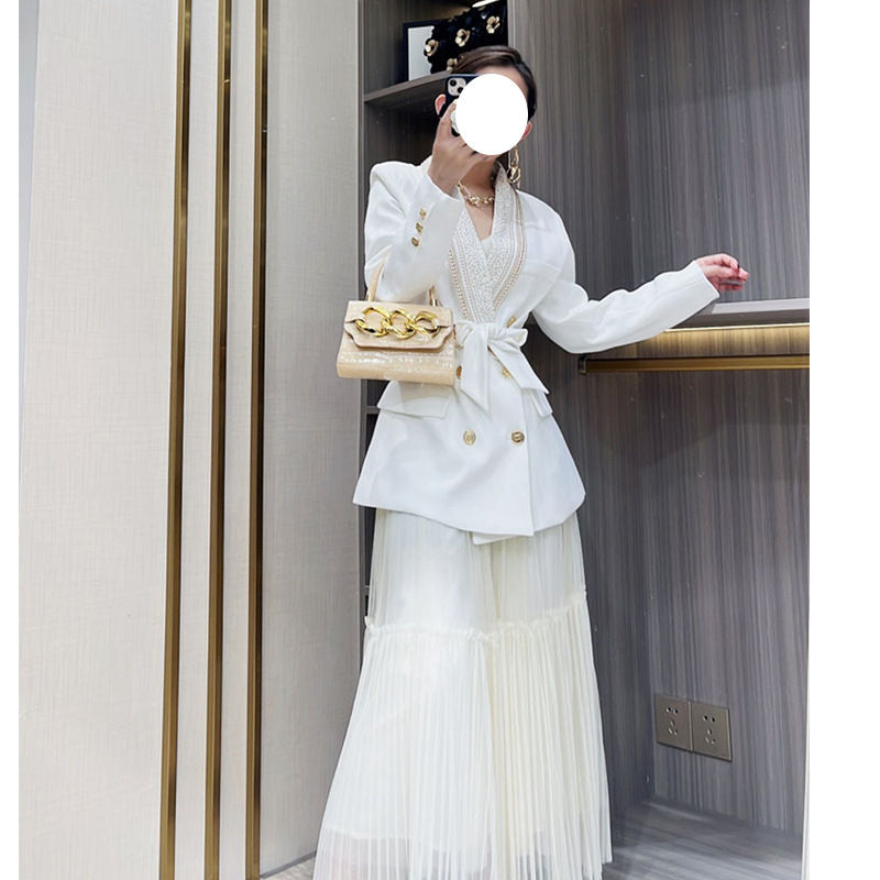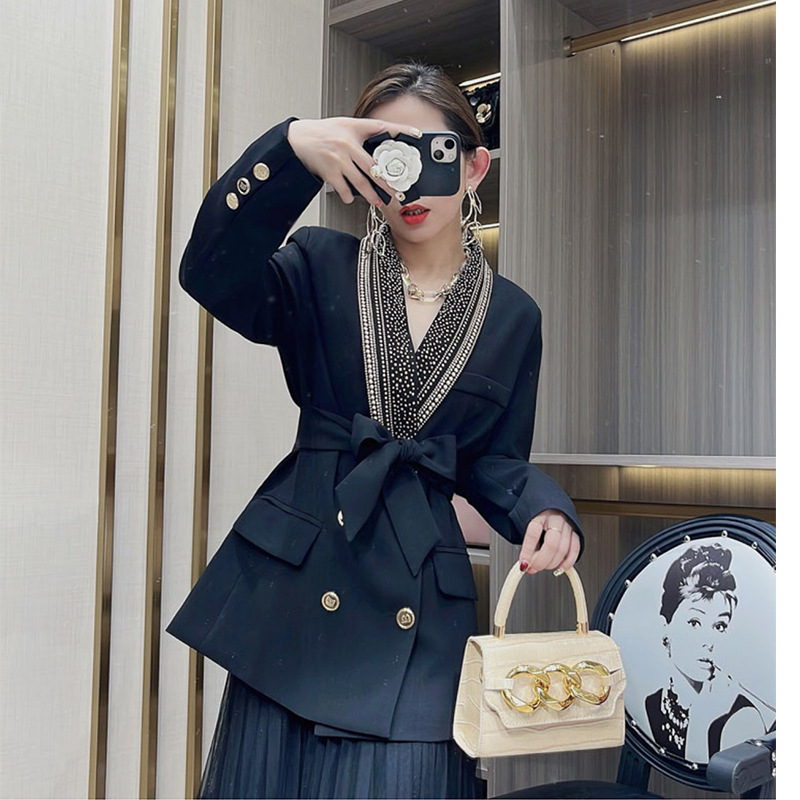 European and American Style Fashion Star New Hot Metal Sheet Tie Belt Fruit Collar Mid-length Suit Jacket for Women