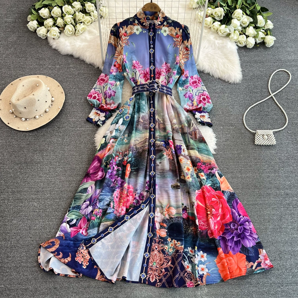 | nameOriginal | European and American style printed palace style dress for women, high-end temperament, elegant, loose waist, single-breasted lady's long skirt |