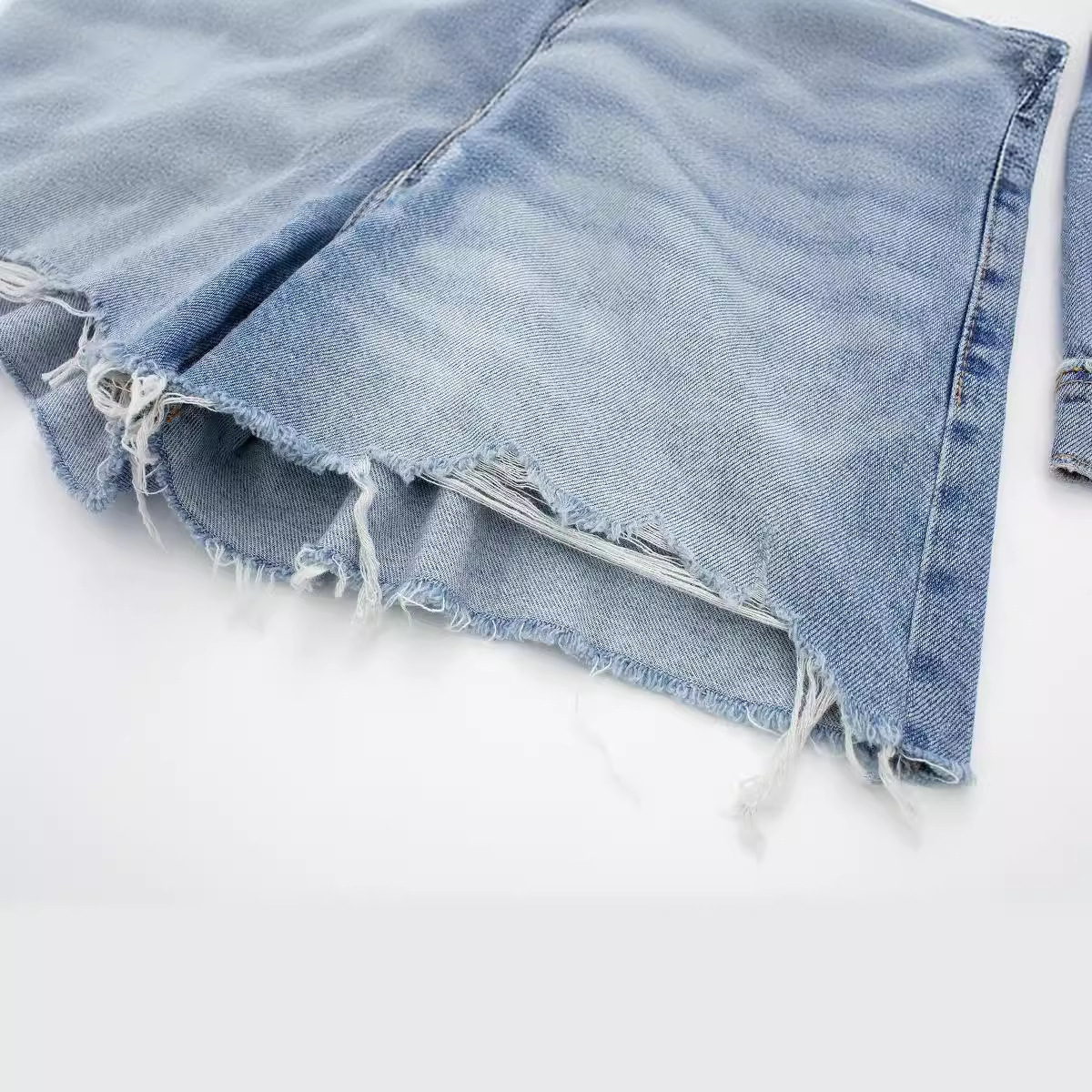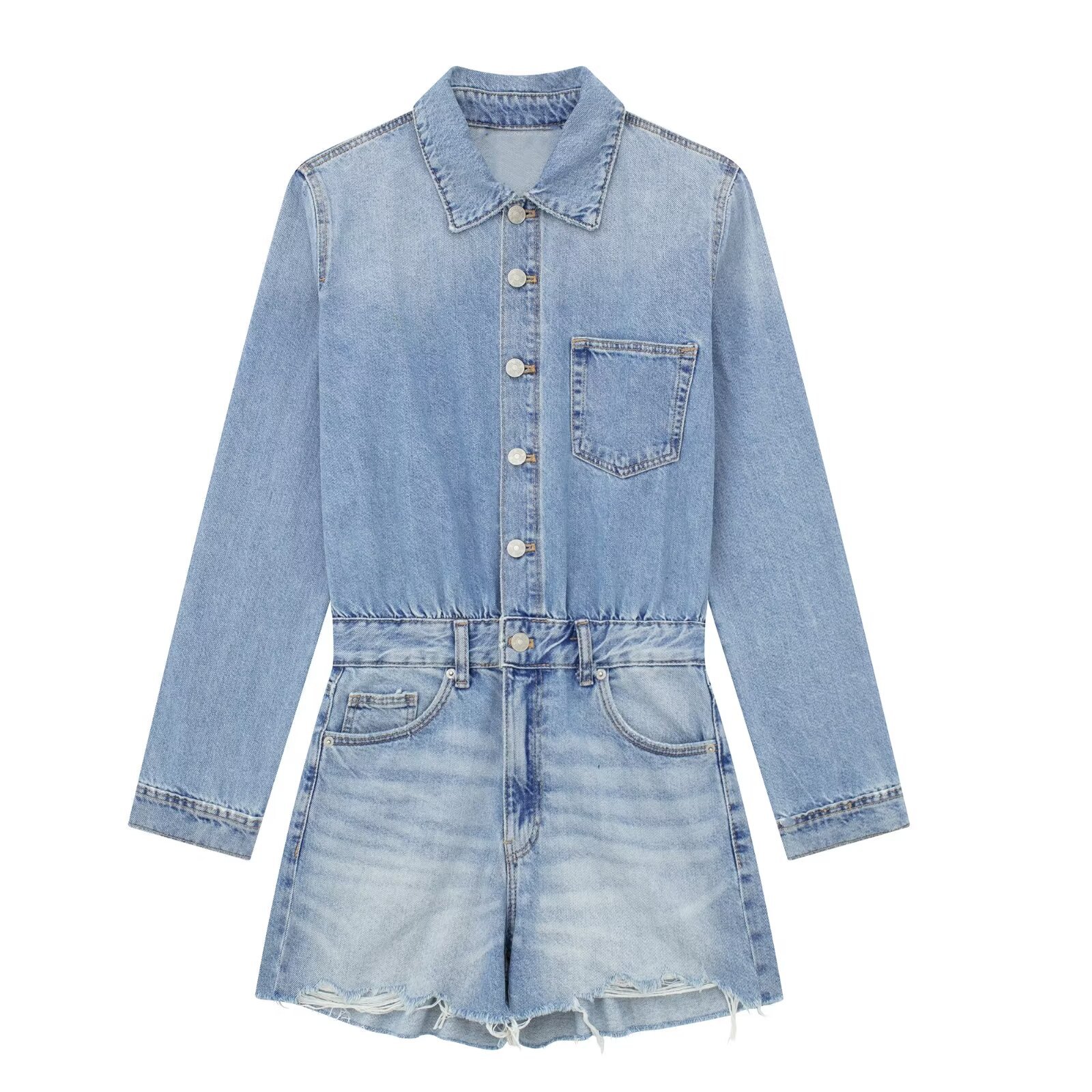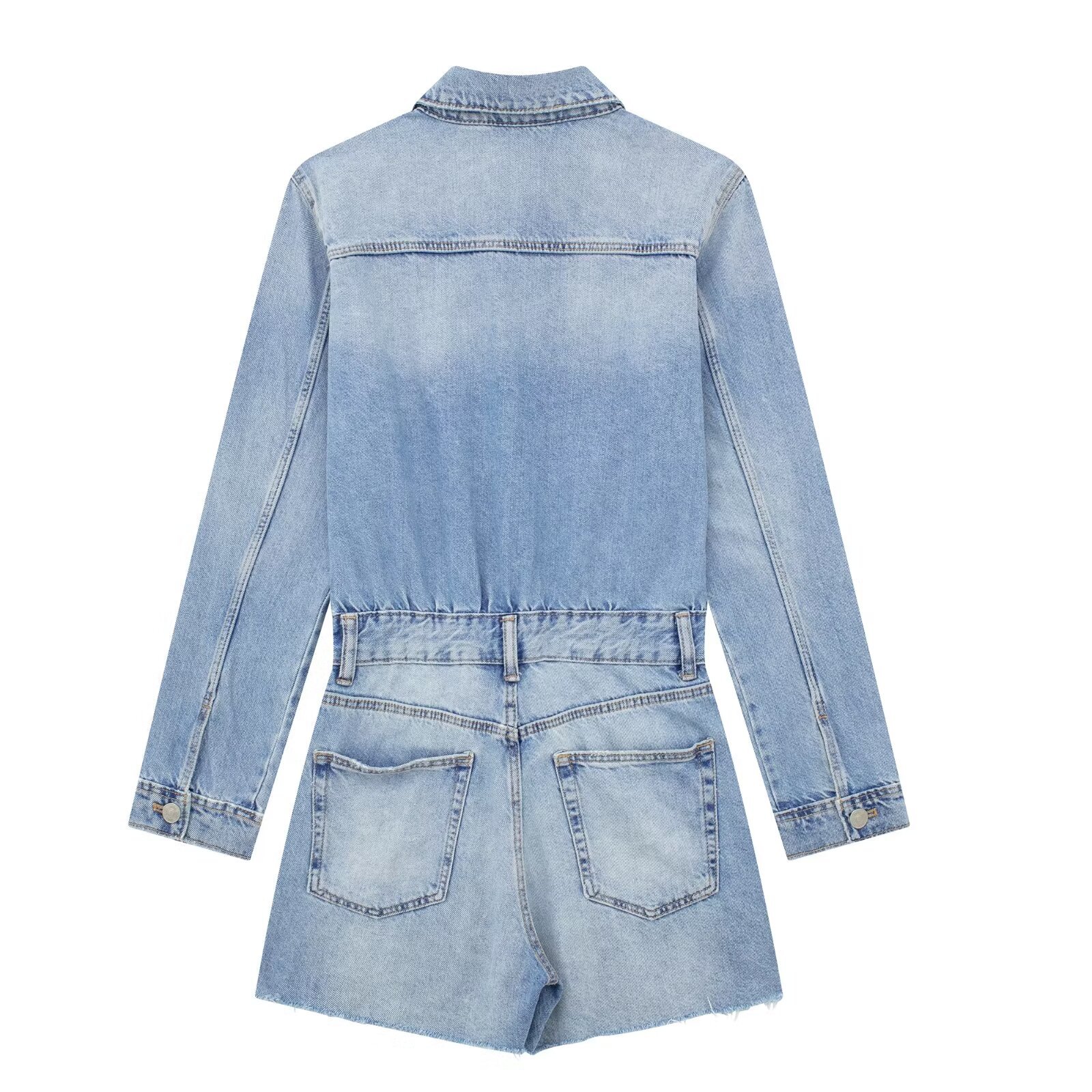 | nameOriginal | European and American style spring new lapel long sleeve single-breasted Denim jumpsuit waist straight burr shorts |