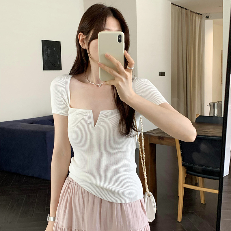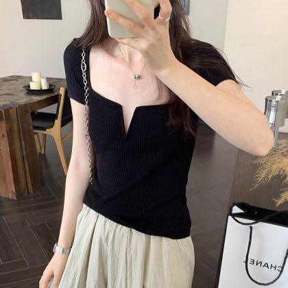 European and American Style Style Small V-neck Retro Pit Striped Knitted Base Shirt Women’s Summer All-match Slim-fit Short-sleeve T-shirt