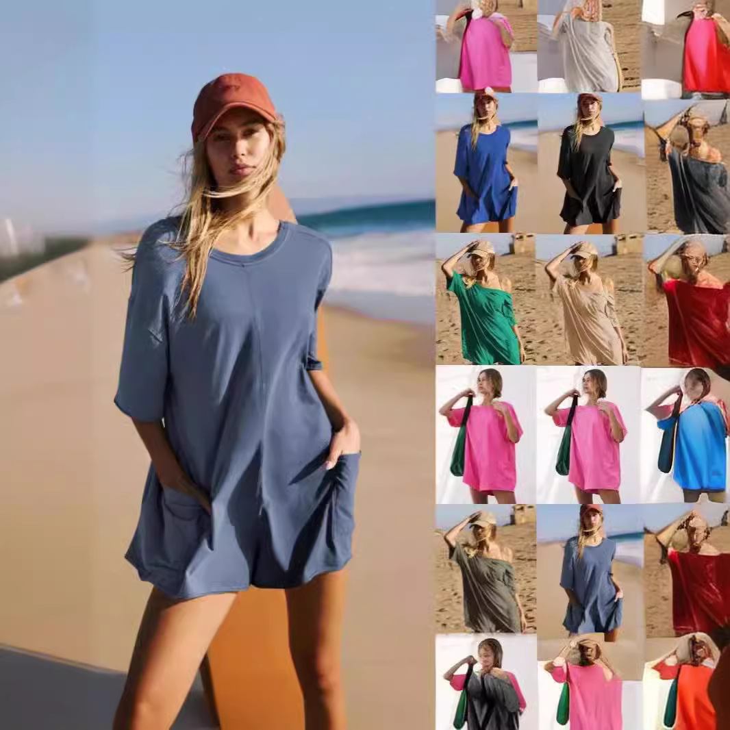 European and American Women’s 2024 Summer New Amazon Women’s Short-sleeved Backless V-neck Loose Casual Pocket jumpsuit