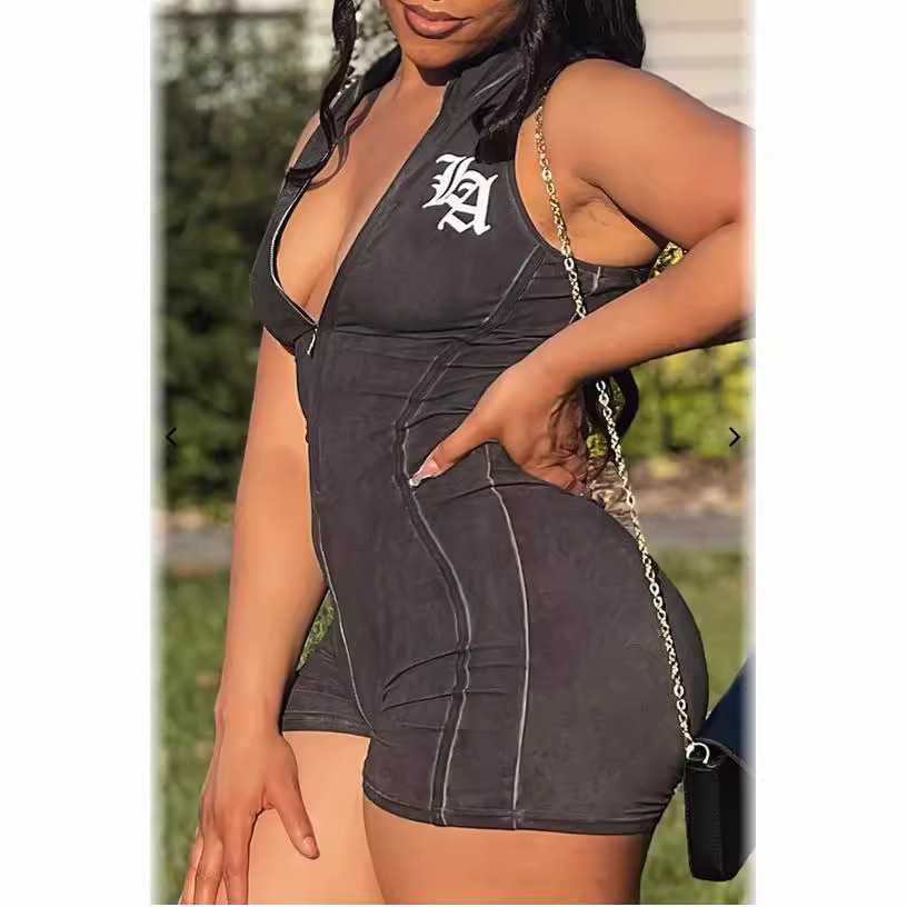 | nameOriginal | European and American women's clothing 2024 spring and summer new stand collar zipper sleeveless stitching sexy tight hip-lifting jumpsuit |