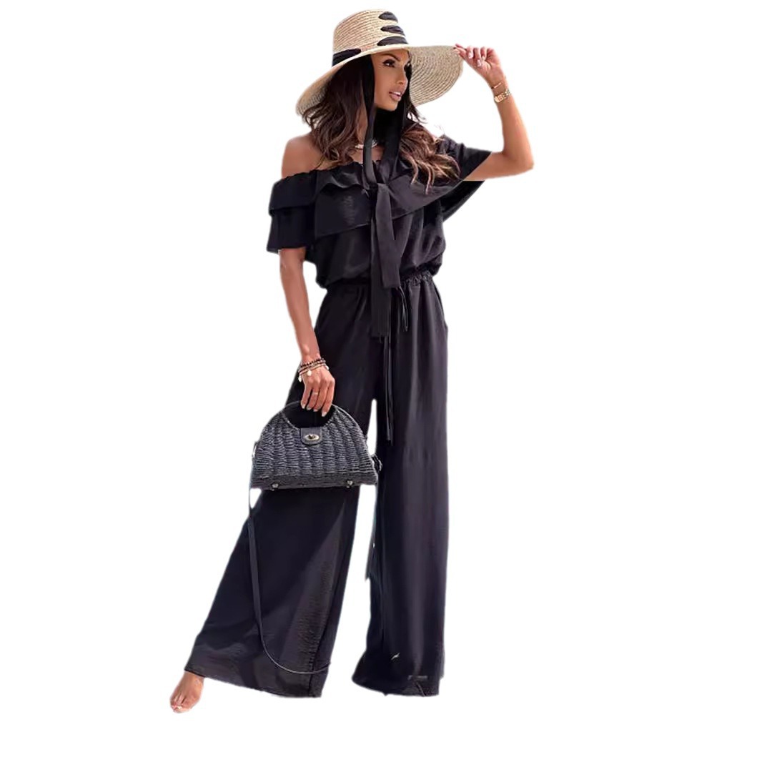 | nameOriginal | European and American women's foreign trade women's cross-border Amazon summer solid color commuter ruffled shoulder short sleeve jumpsuit |