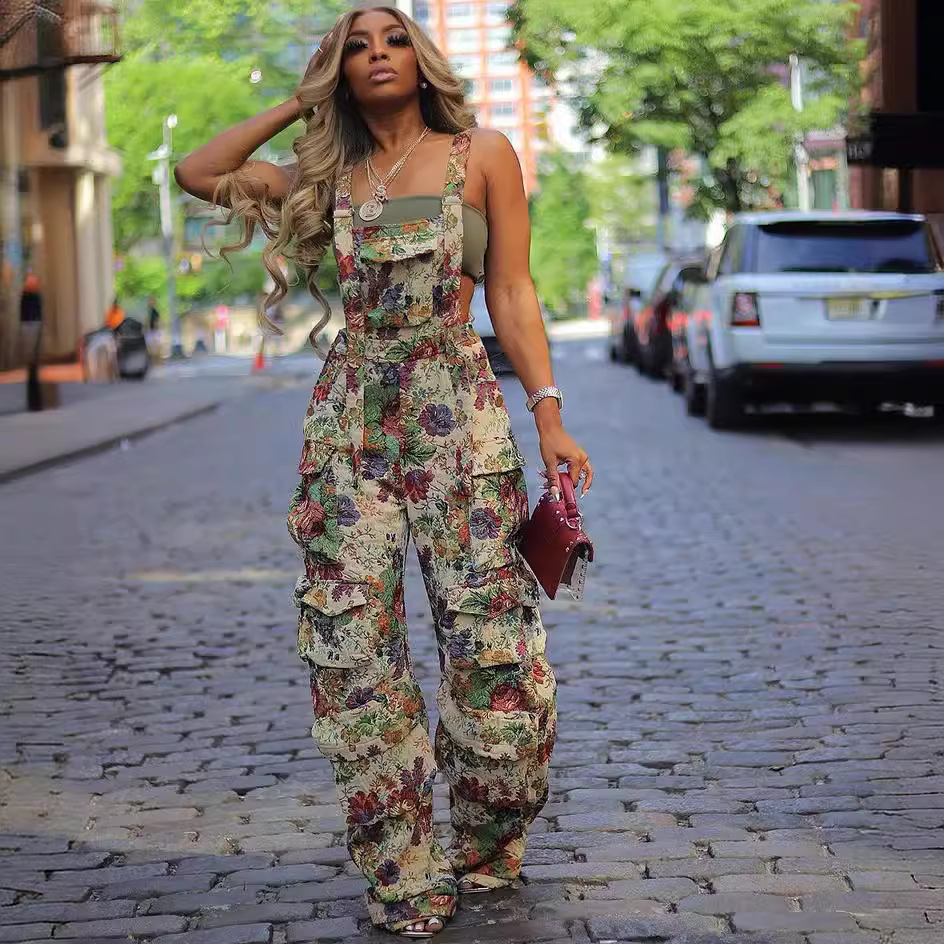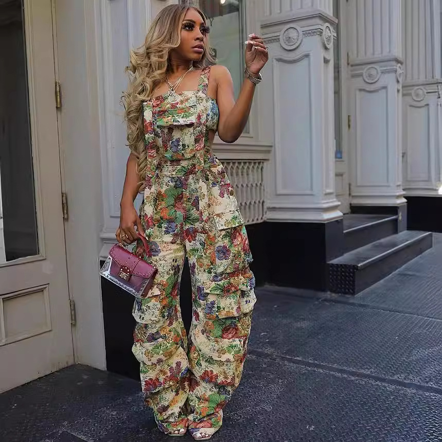 | nameOriginal | European and American women's loose suspenders Amazon cross-border women's summer street fashion multi-pocket printed jumpsuit |