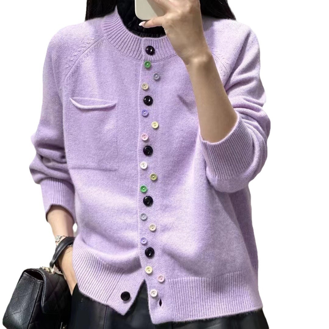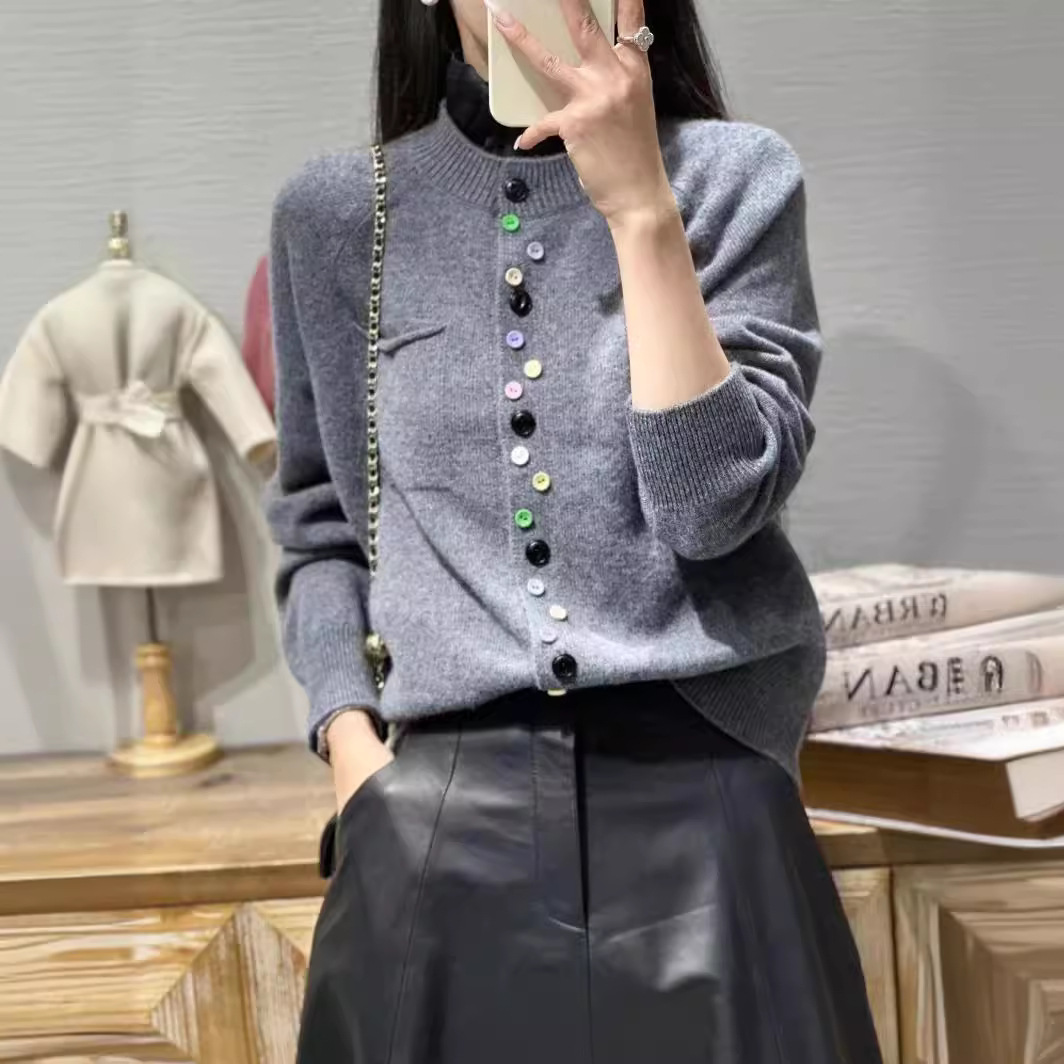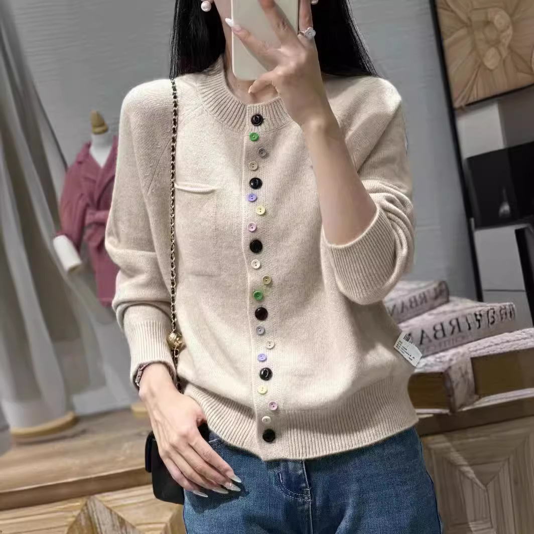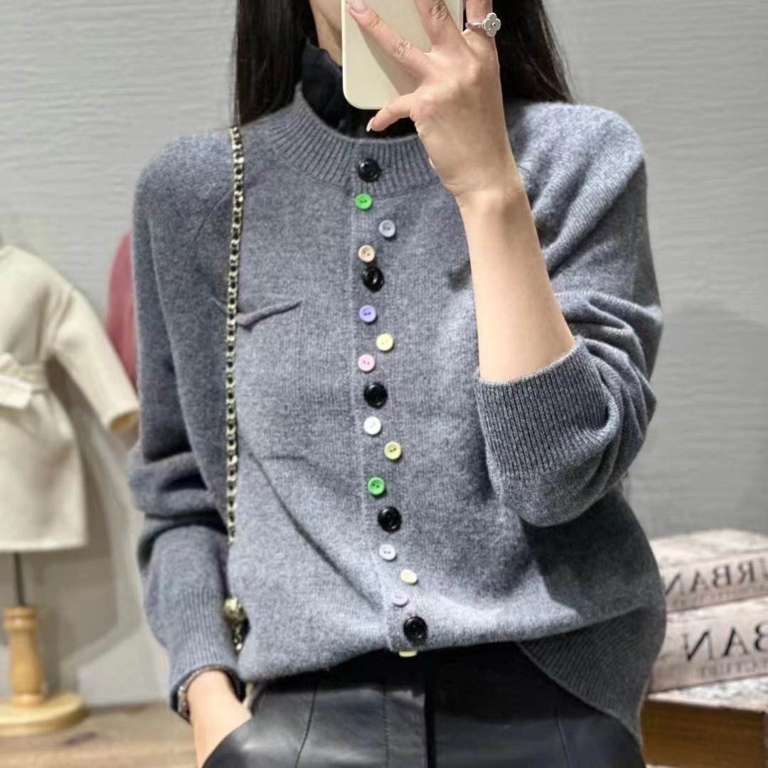 European goods early autumn high-end spring round neck single pocket irregular color buckle knitted cardigan for women 2023 new sweater for women