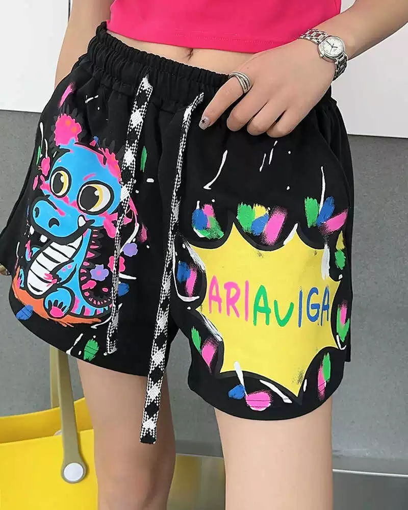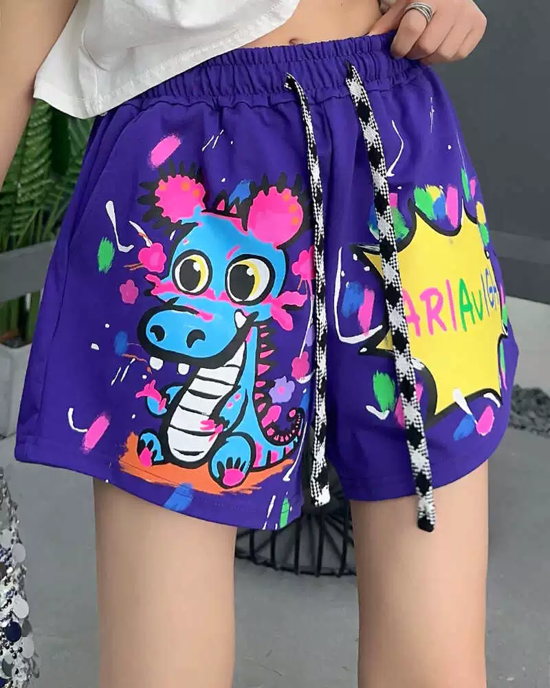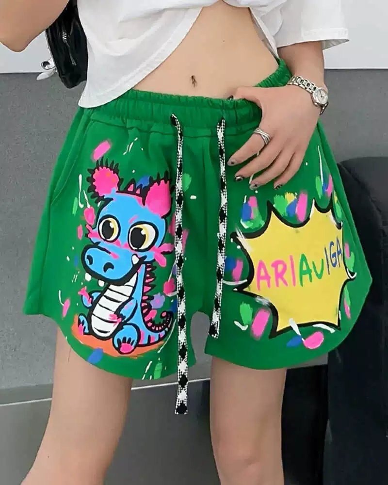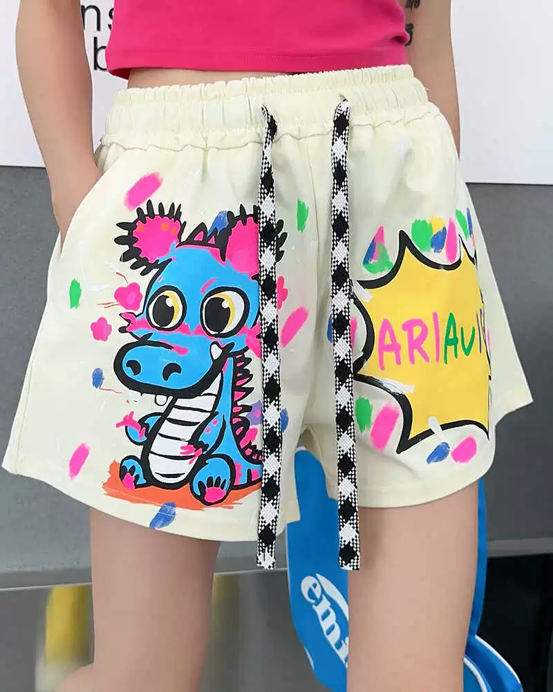 | nameOriginal | European goods large version fun cartoon dinosaur pattern shorts women's casual loose high-waisted slim pants graffiti five-quarter pants |