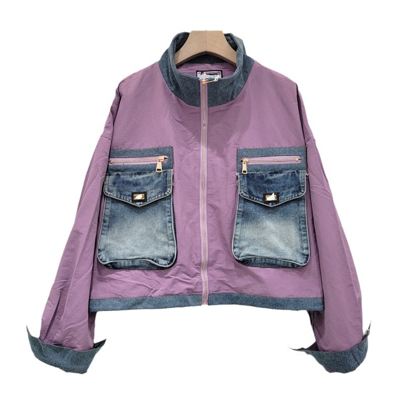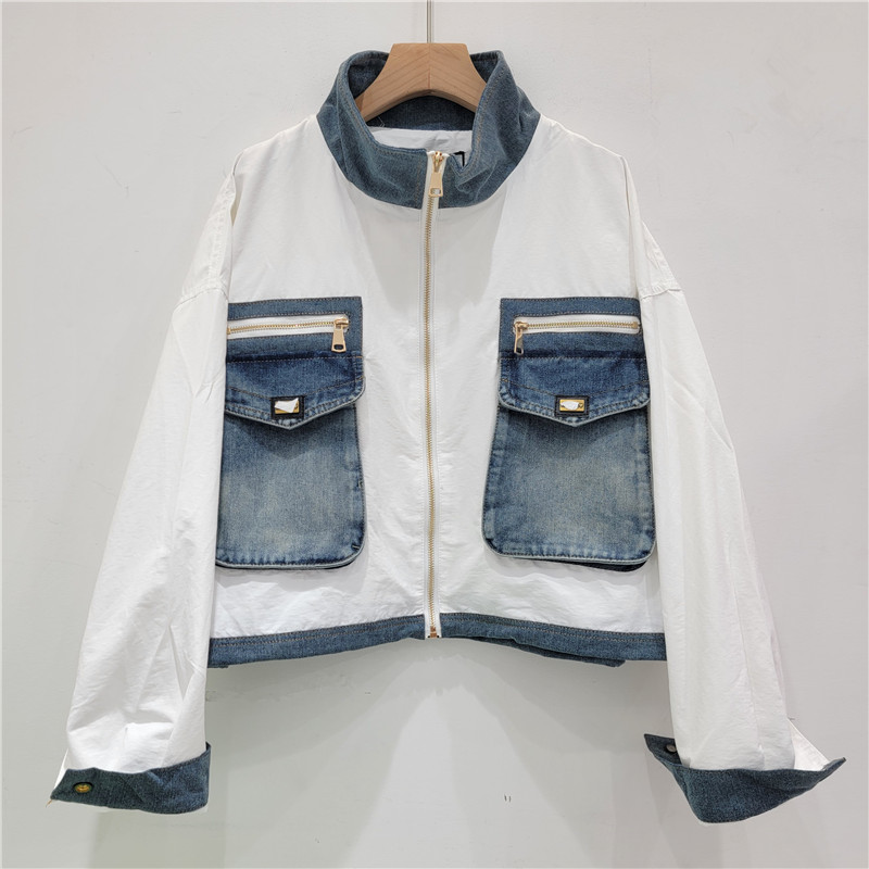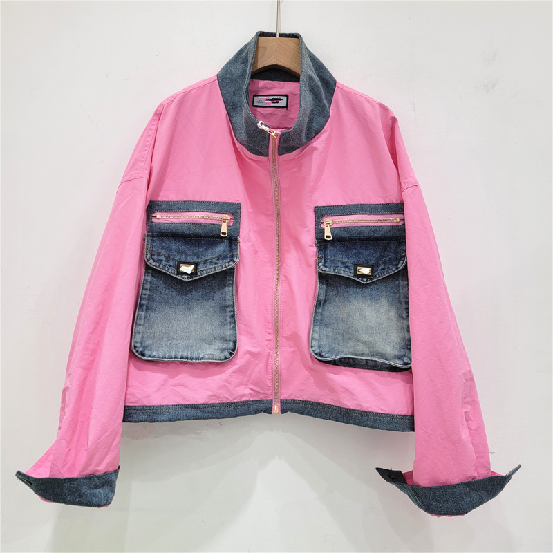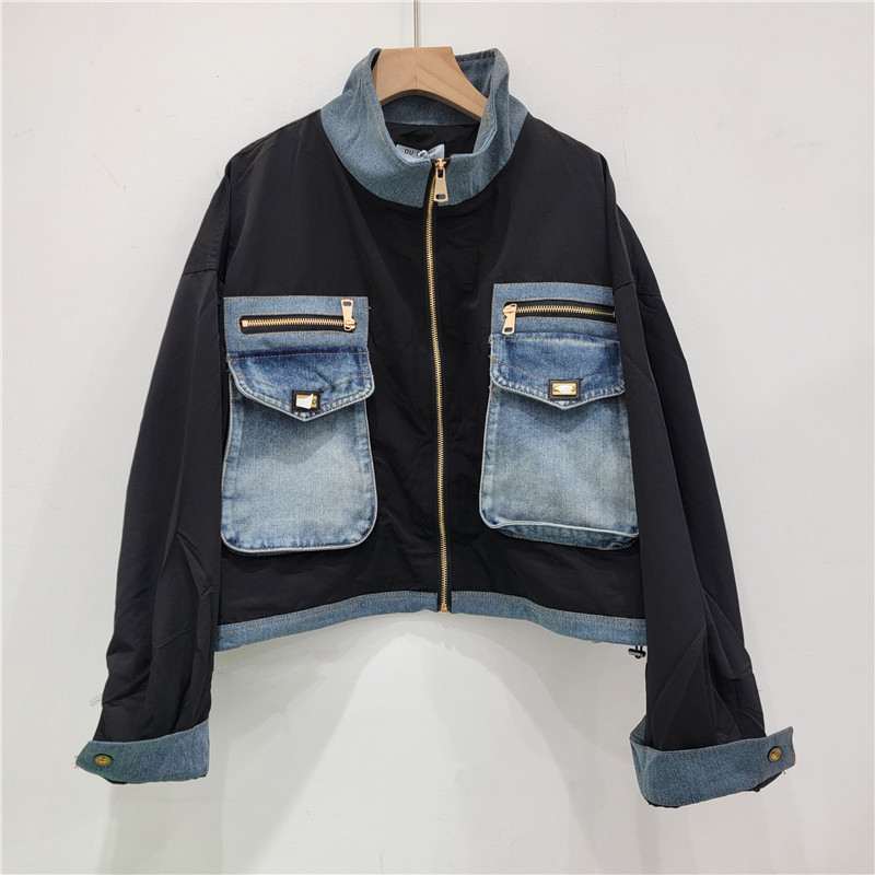 | nameOriginal | European goods motorcycle clothing women's 2024 autumn new heavy industry stitching Denim big pocket color contrast collar short coat tide |