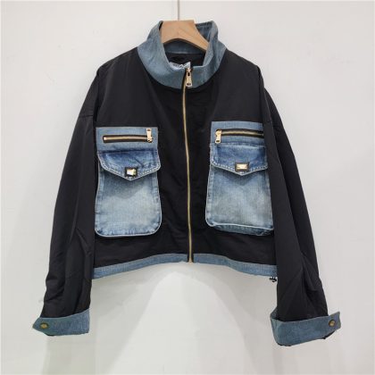 | nameOriginal | European goods motorcycle clothing women's 2024 autumn new heavy industry stitching Denim big pocket color contrast collar short coat tide |
