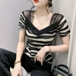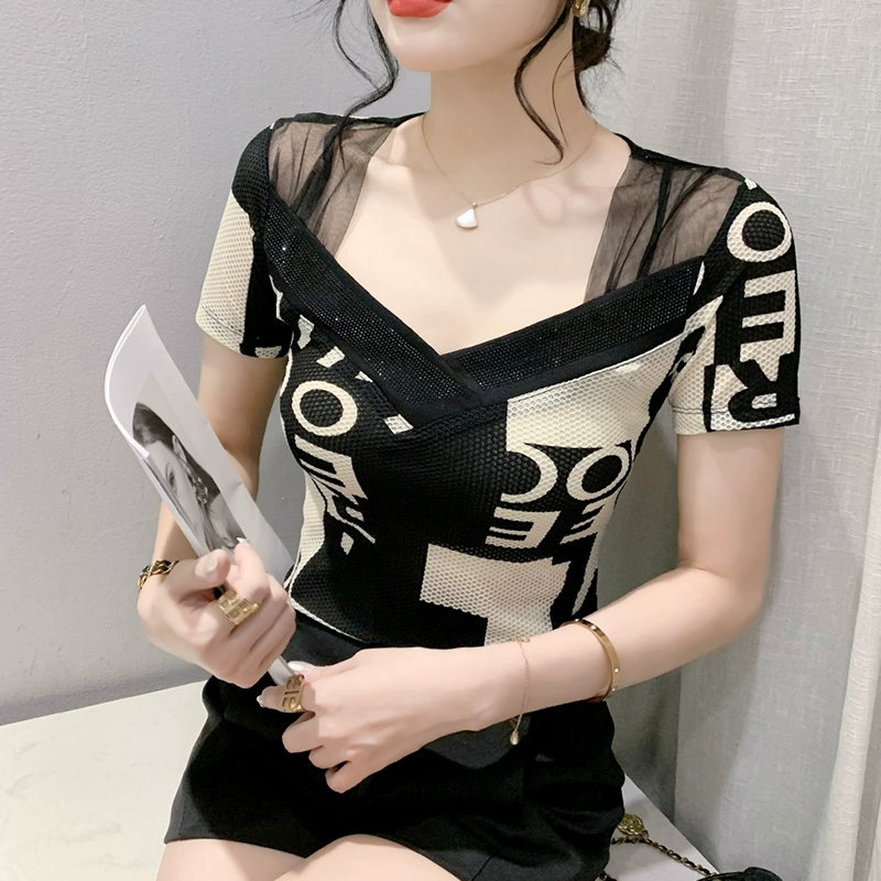 | nameOriginal | European mesh splicing short-sleeved T-shirt for women, fashionable and sexy V-neck shirt, designed with hot diamond print, slim fit top |