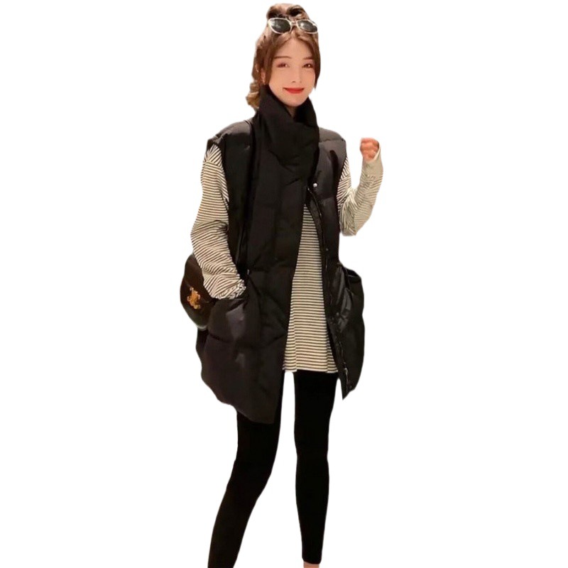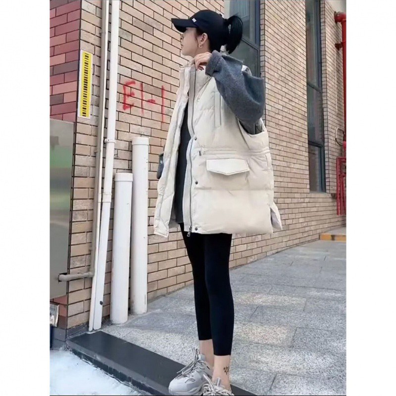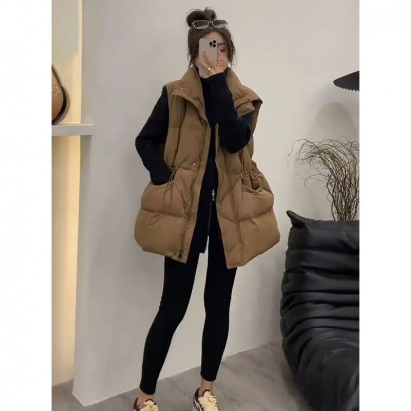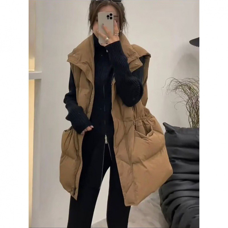 European Mid-length Down Vest Women’s Outer Wearing Vest 2024 Autumn and Winter New Drawstring Waist Waistwaistcoat Vest Jacket