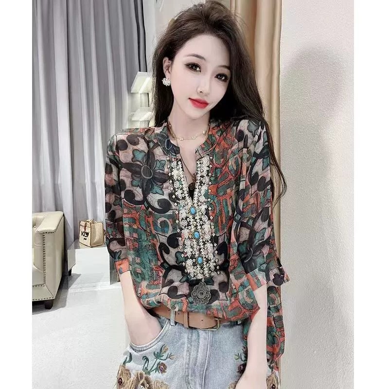 | nameOriginal | European station 2024 new Korean style retro floral shirt beaded five-quarter sleeve T-shirt loose age-reducing versatile top |