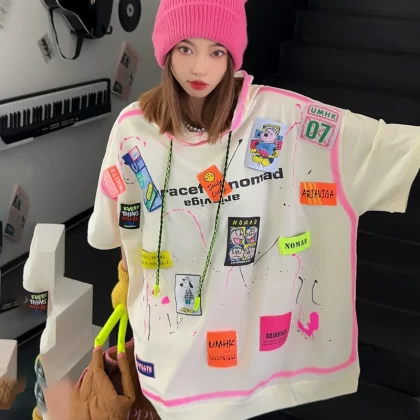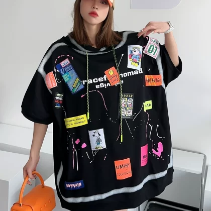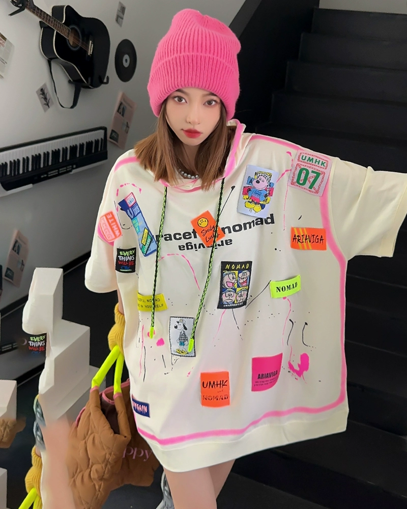 | nameOriginal | European station 2024 summer new style hooded half-sleeved fashion printed mid-length heavy industry labeling loose T-shirt women's trend |