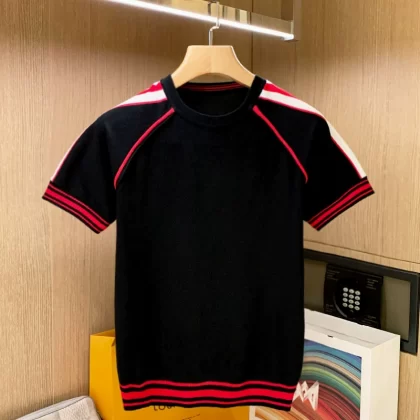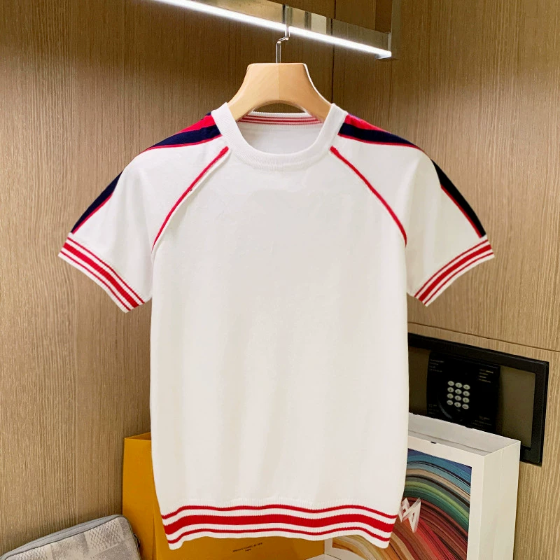 | nameOriginal | European station trendy tops for men, color block striped T-shirts, summer casual topstitching, slim knitted short sleeves for men |