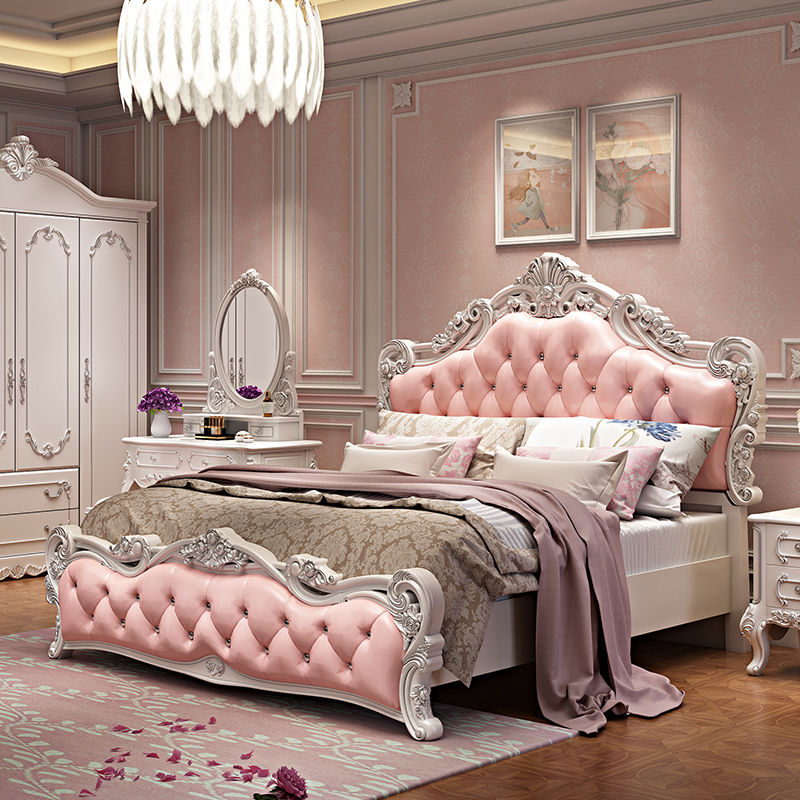 European Style Bed Modern Simple Solid Wood Princess Bed Master Bedroom Furniture Combination suit Simple European Double Bed Pink Leather Wedding Bed