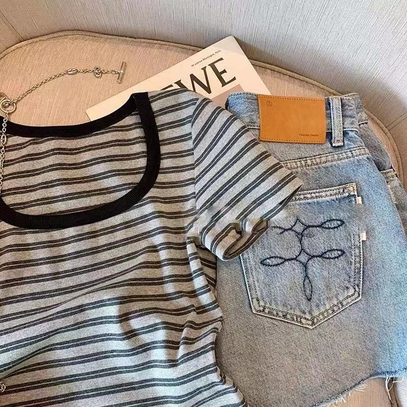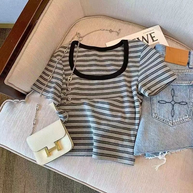 | nameOriginal | European style retro striped square collar front shoulder short sleeve T-shirt women's hot girl casual temperament niche age-reducing all-match top |