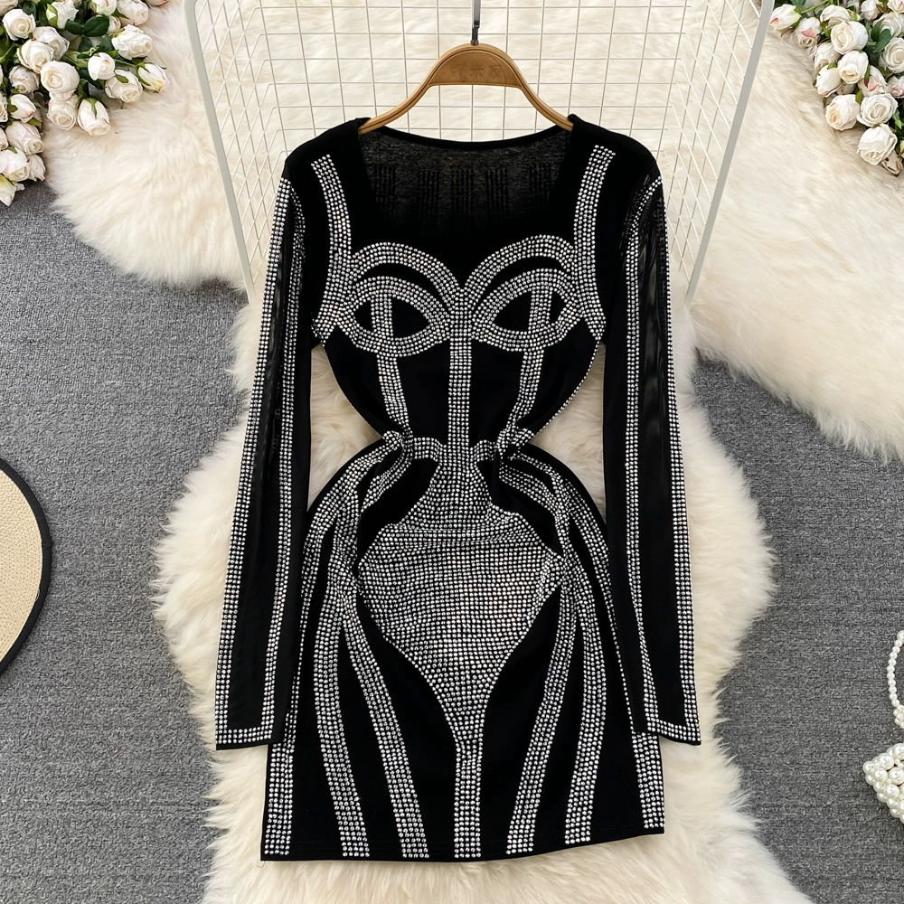 European Style Square Neck Long Sleeve Diamond Dress