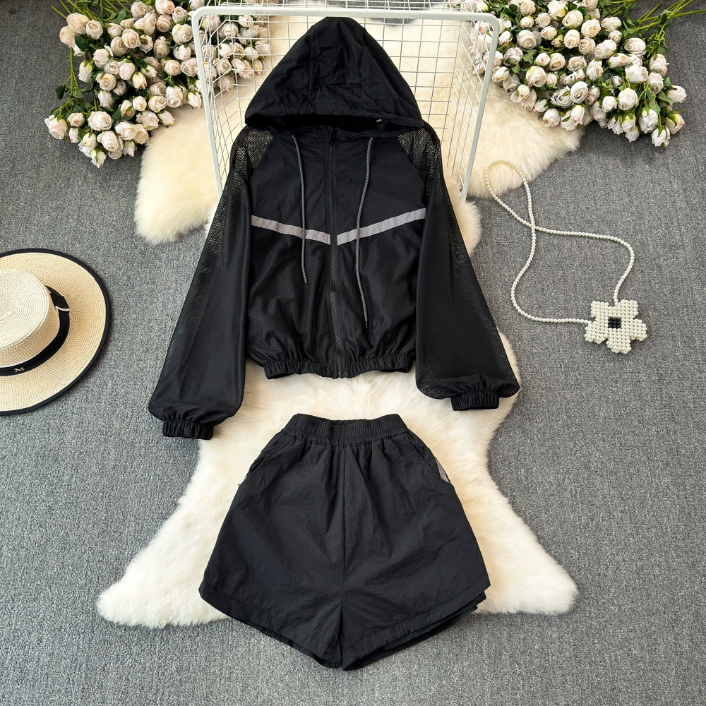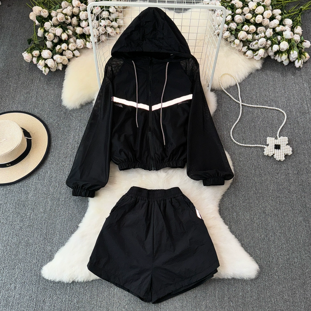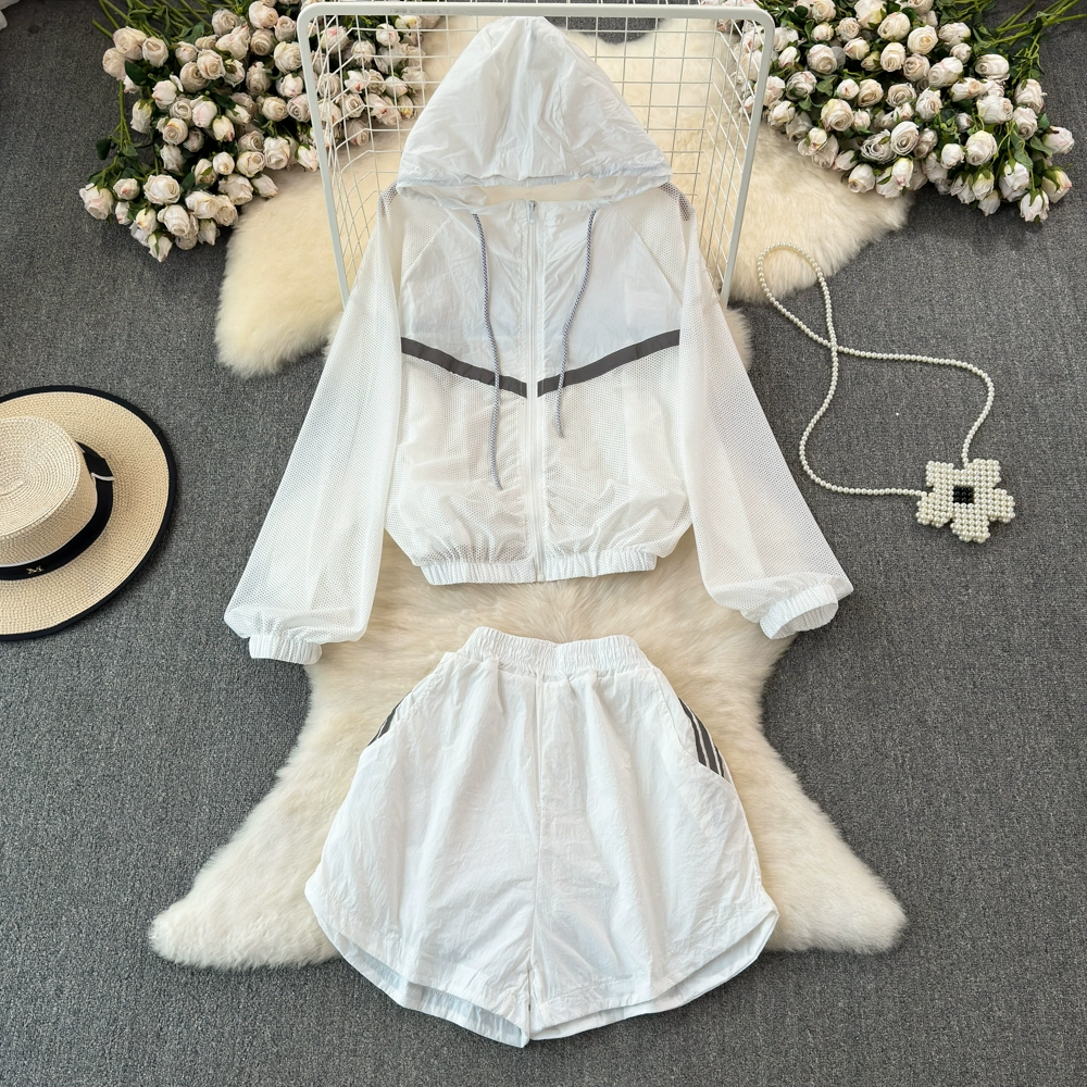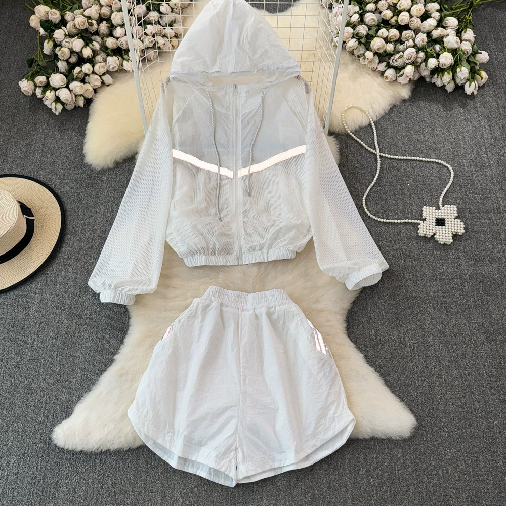 European summer new style mesh ice silk sun protection clothing suit for women, luminous breathable thin sports shorts two-piece set for women