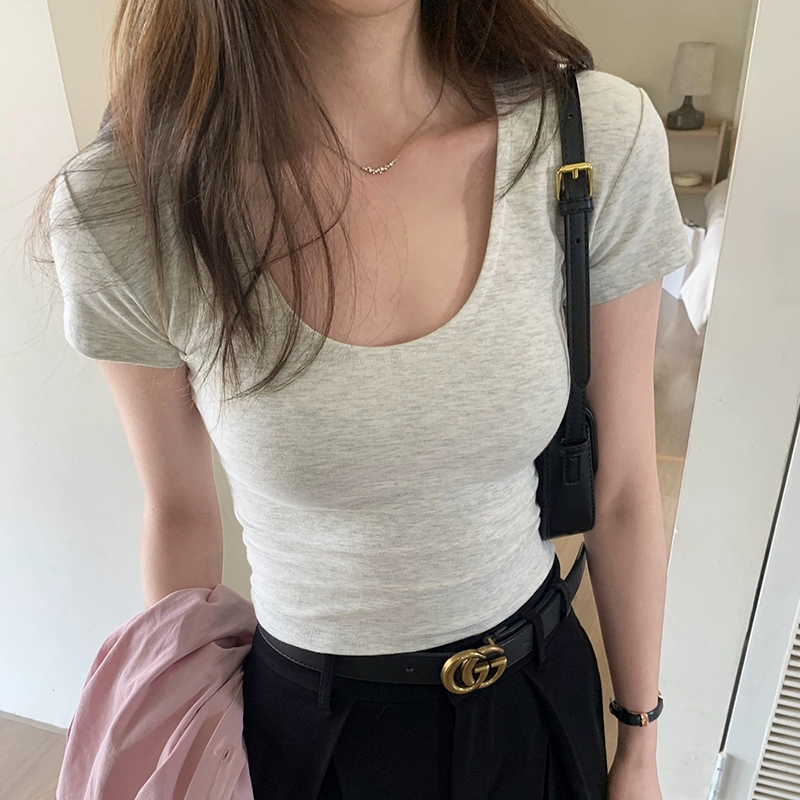 | nameOriginal | European U-neck slim-fit waist-exposed right-shoulder slim short-sleeved T-shirt |