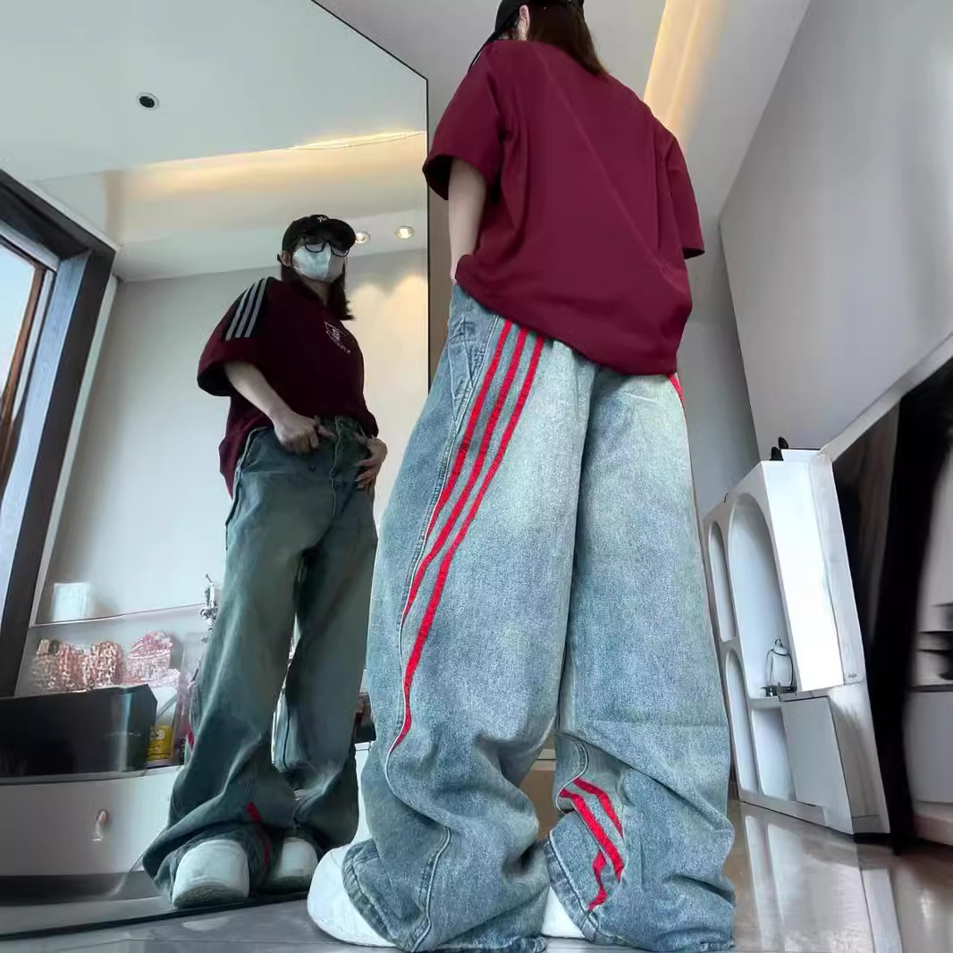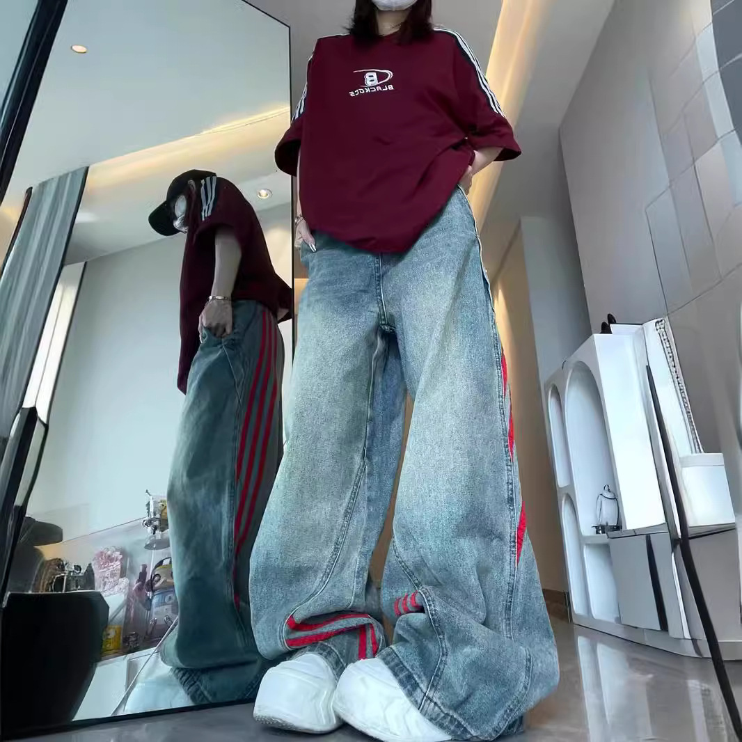 Explosive Artist with Half-elastic Waist Stripe Design Sense Summer Thin Washed Retro Wide Leg Loose Jeans for Women