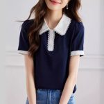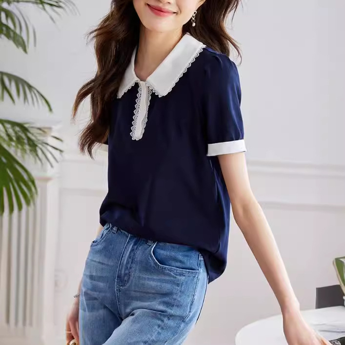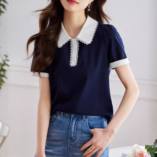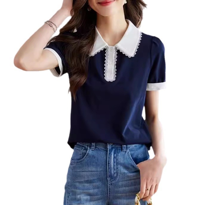 Exquisite Lace Contrast Color POLO Collar T-shirt Women’s 2024 Summer Fresh and Elegant Age-reducing Slimming All-match Short-sleeve Top