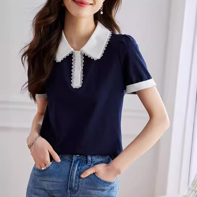 Exquisite Lace Contrast Color POLO Collar T-shirt Women's 2024 Summer Fresh and Elegant Age-reducing Slimming All-match Short-sleeve Top