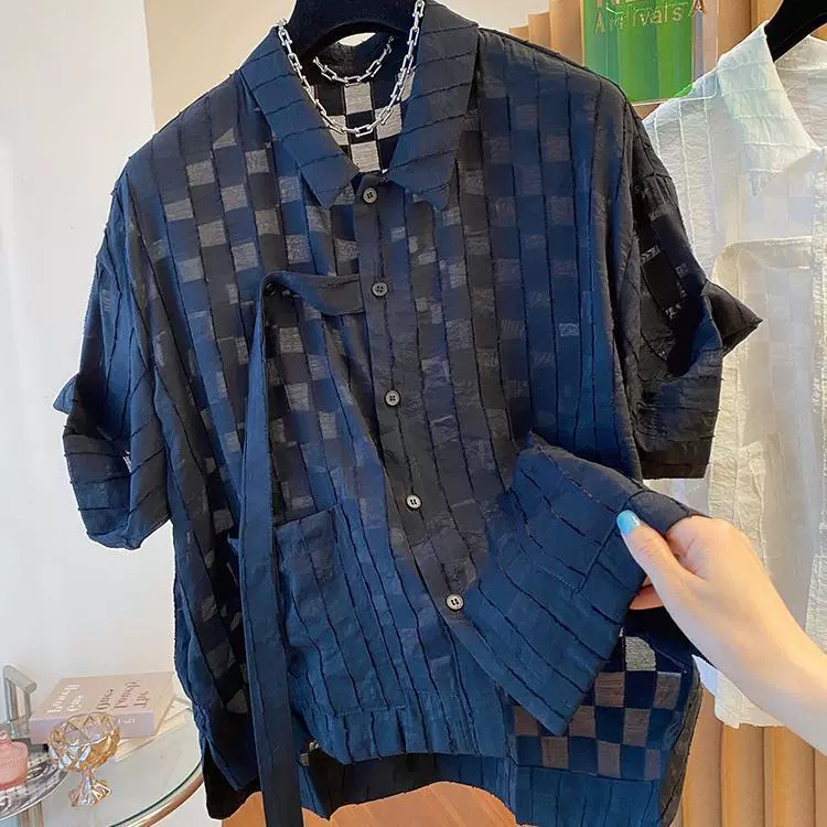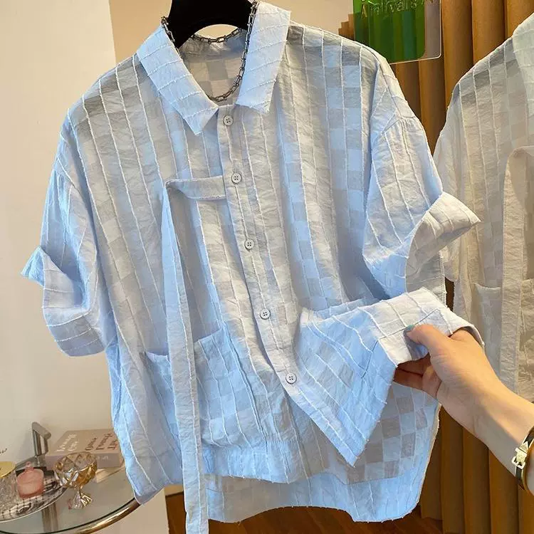 | nameOriginal | Extra large size fat mm ribbon loose short-sleeved plaid shirt |