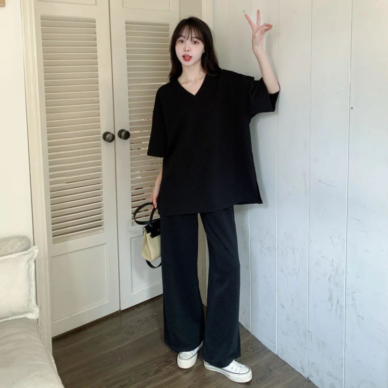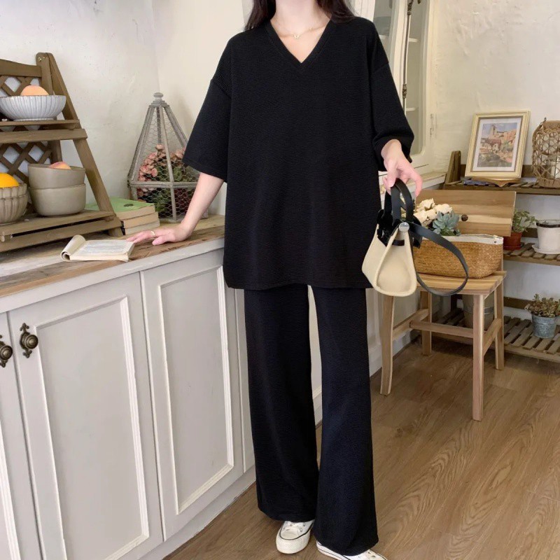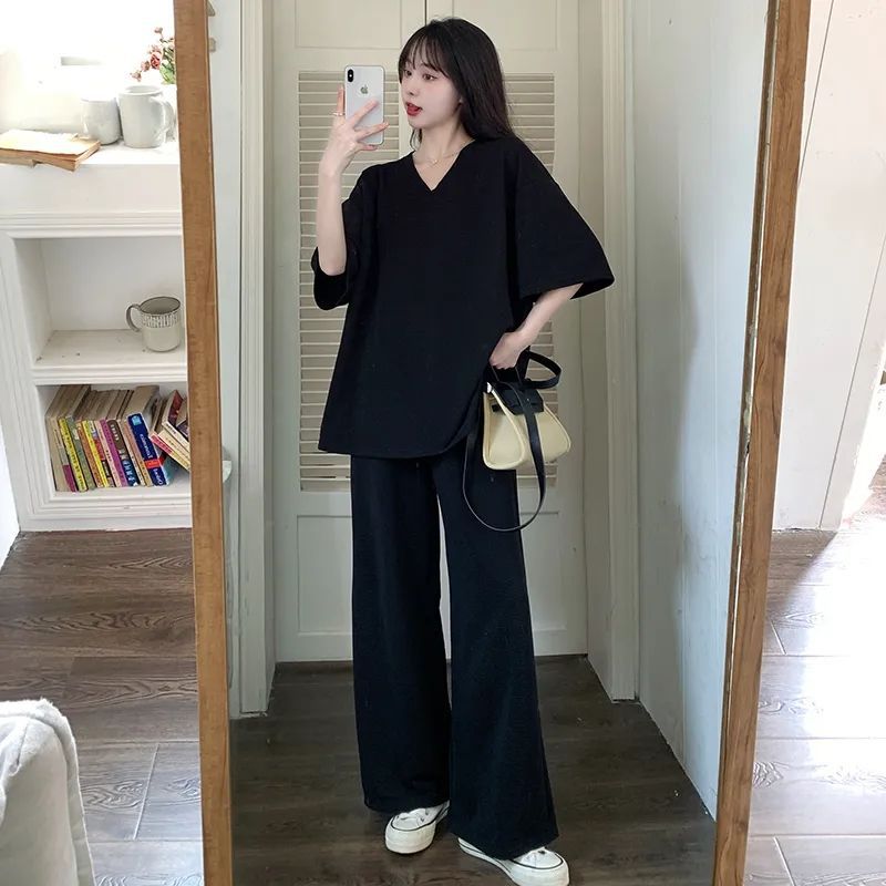 | nameOriginal | Extra Large Size Korean Style Slimming Casual suit Women's Summer 1.00 kg-150.00 kg Chubby mmV Collar Short-sleeved Wide-leg Pants Two-piece Set |