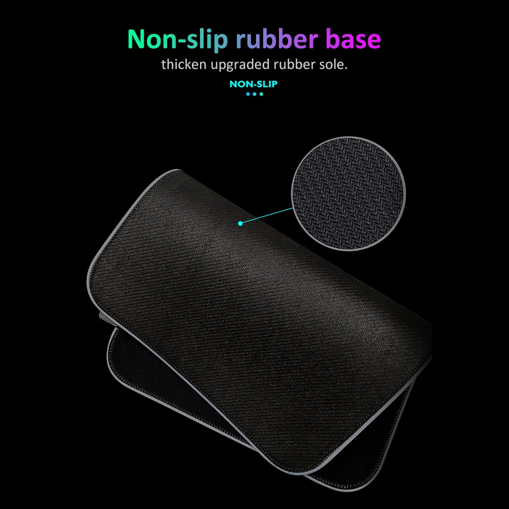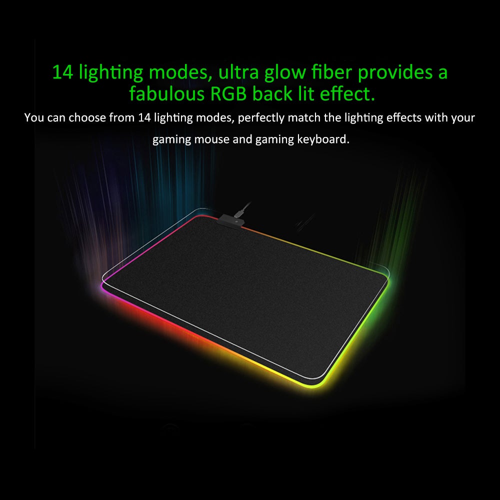 This product is easy to use as it is powered by USB and requires no drivers. It also features one-touch control for added convenience. With 14 lighting modes to choose from, the ultra glow fiber provides a stunning RGB backlit effect. The mouse pad is designed with a premium fine-mesh cloth surface, allowing for more precise mouse movement. Additionally, the non-slip rubber base has been upgraded with a thicker sole for added stability.