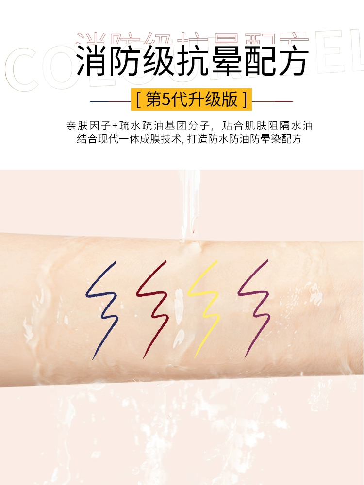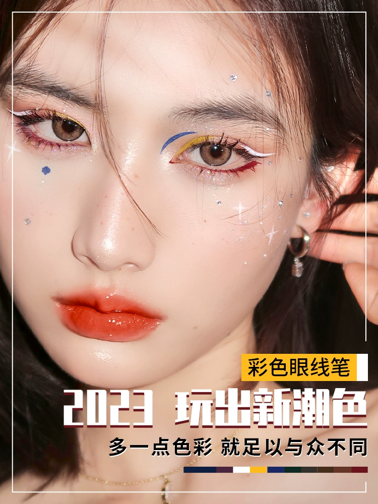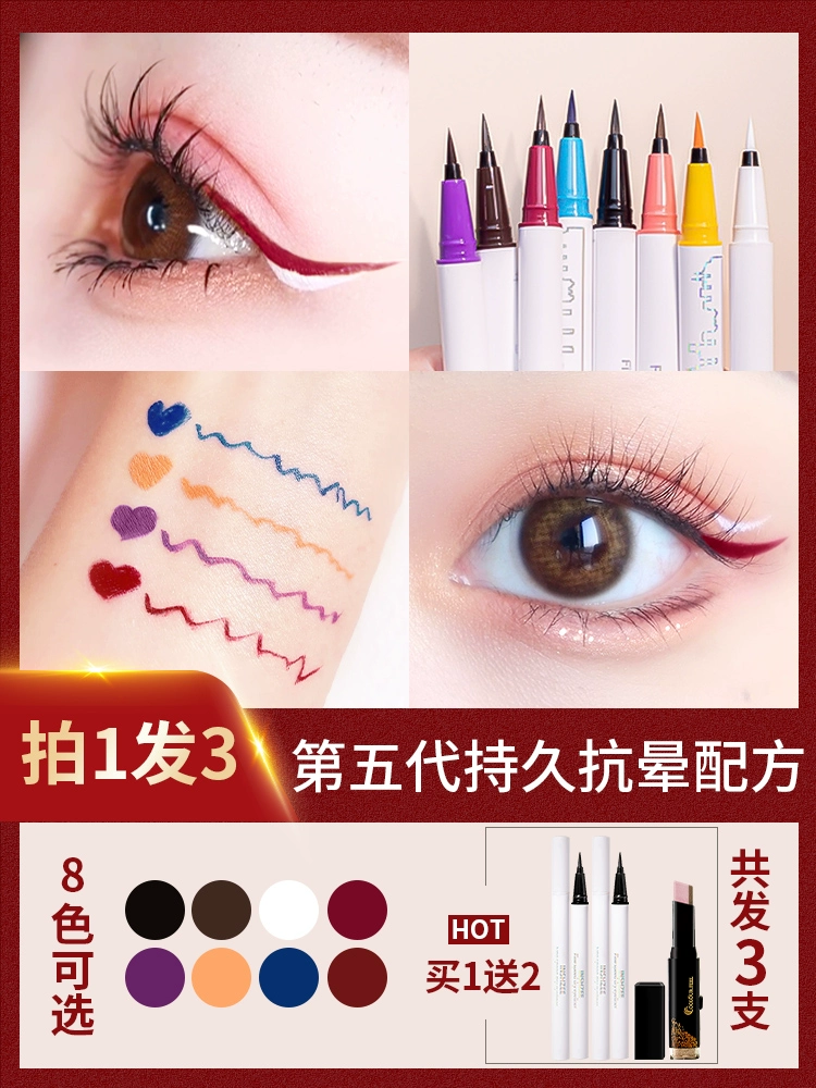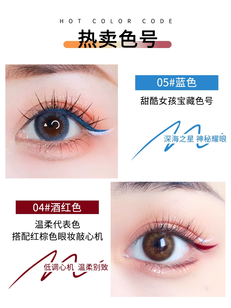| nameOriginal | Eyeliner, non-smudged, waterproof, long-lasting, burgundy, white, and blue, liquid eyeliner, gelled inside the eyelids and down to the eyeshadow |
