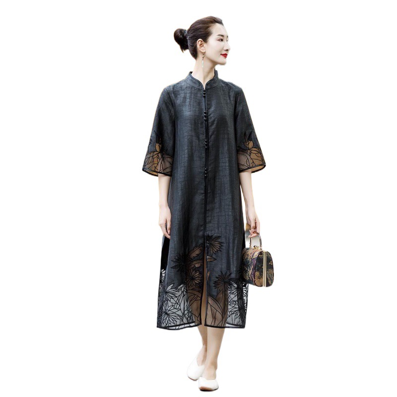 F Ming 3 Xiangyun Yarn Windbreaker Women’s Summer New Mid-Sleeve Coat Black Chinese-Style Collar Embroidered Hanging Long Outer Wearing