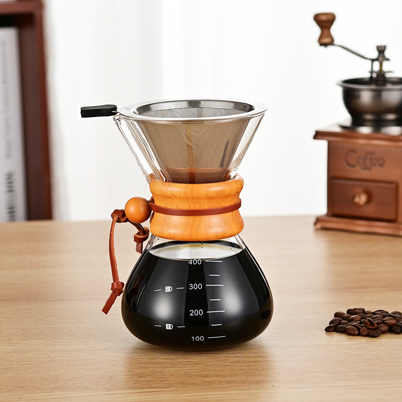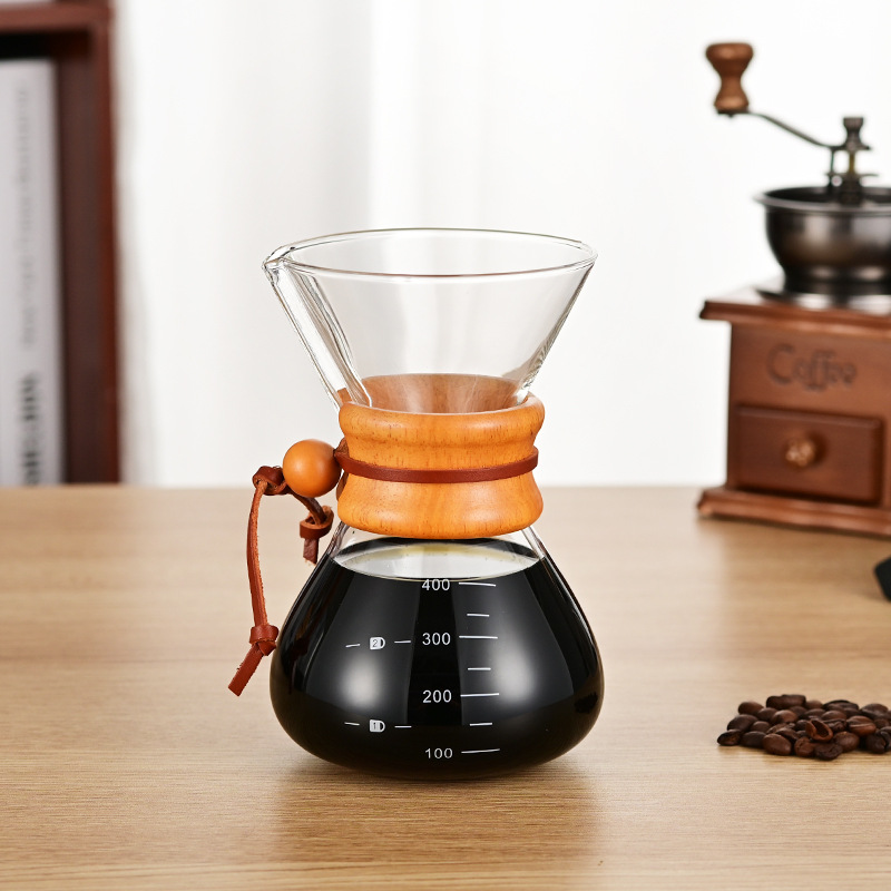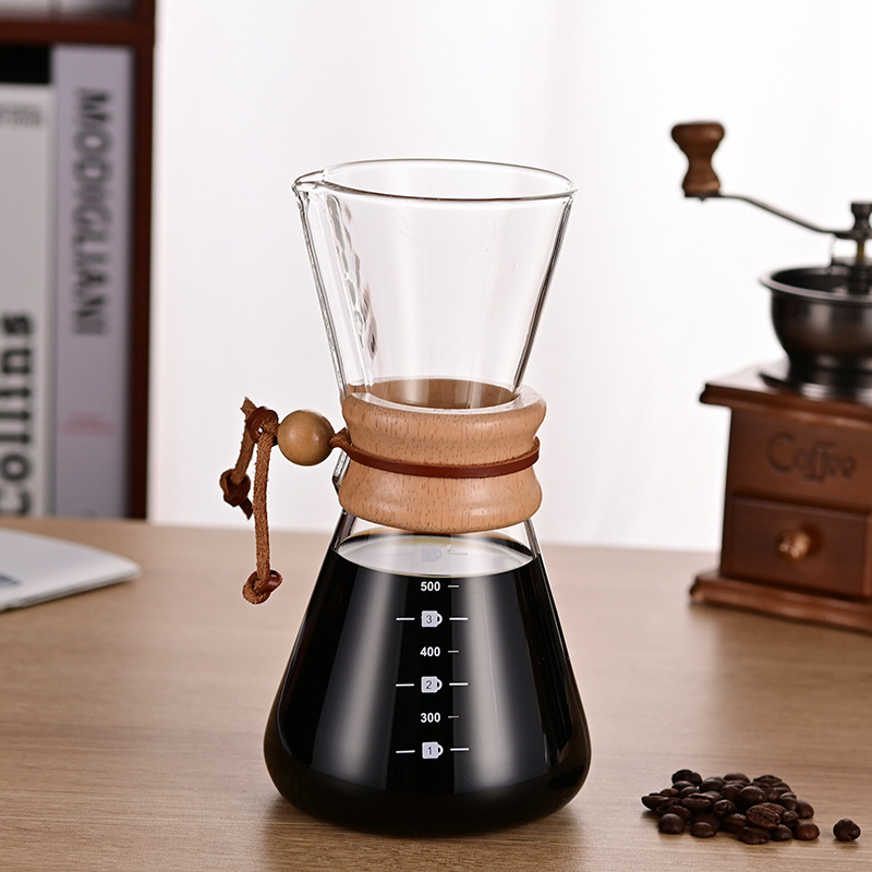| nameOriginal | Factory supply high borosilicate glass coffee pot with scale marking hand brewing pot wood chip sharing pot can do logo |