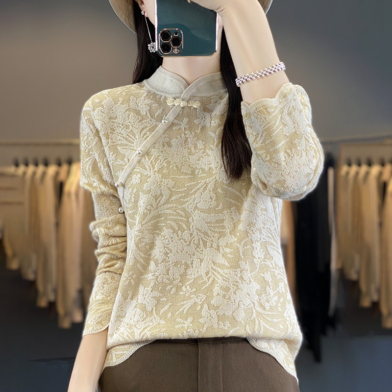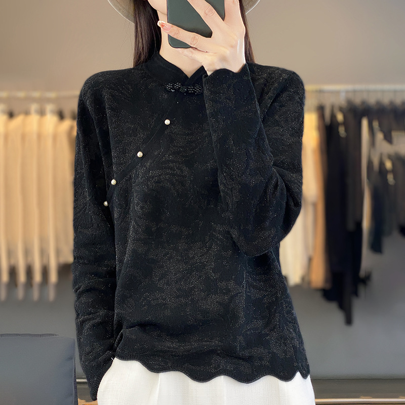 | nameOriginal | Factory wholesale 2024 New Chinese style 16-pin mulberry silk stitching wool National style pearl buckle silk sweater |