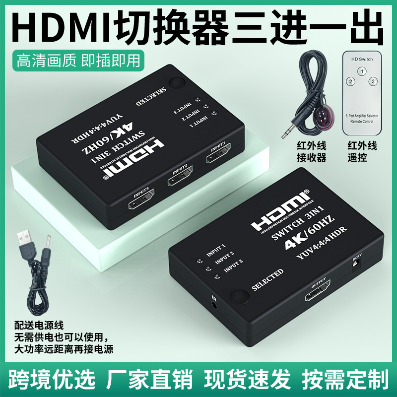 Factory wholesale hdmi3 in 1 out 4K60hz HD video switcher converter with infrared remote control power cord