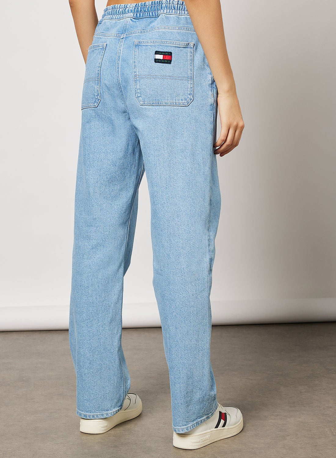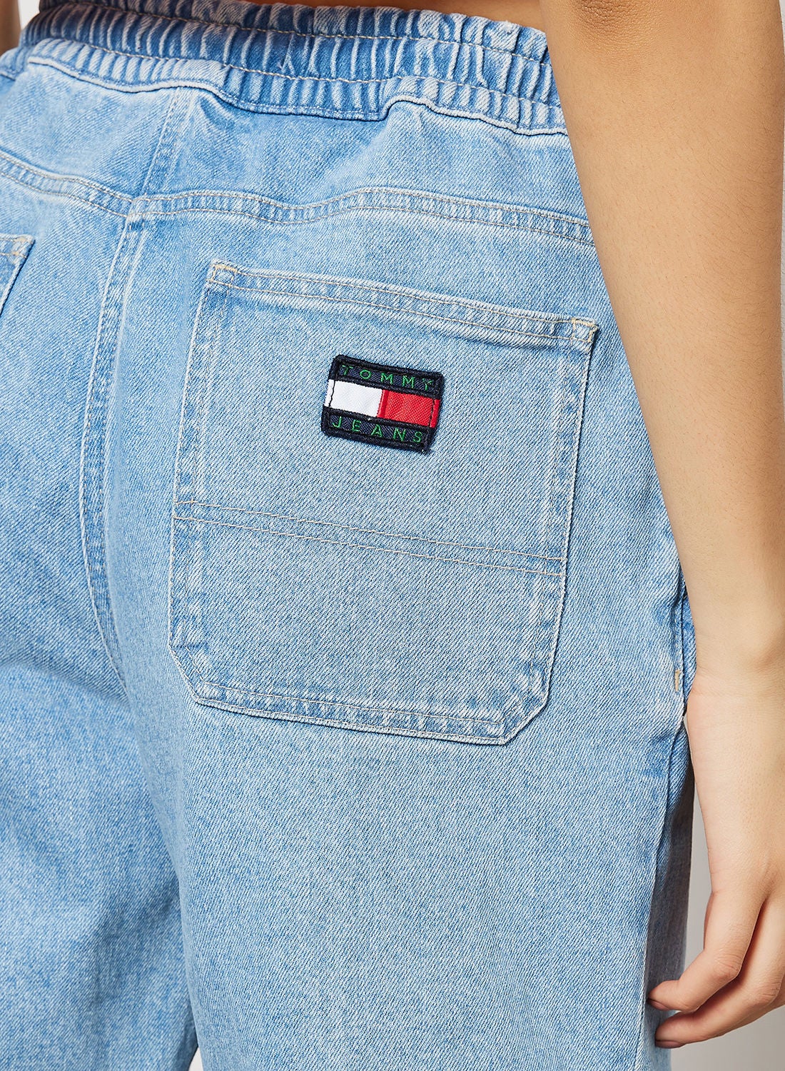 This product features a denim fabric that is both textured and comfortable, made from a blend of cotton. The waistband is elasticated and comes with adjustable drawstrings for a perfect fit. It also has convenient slip-in pockets on both sides and a wallet pocket. The product is adorned with the signature branding detail of Tommy Jeans. To maintain its quality, it is recommended to follow the care label instructions when washing. The model in the picture is approximately 174 cm tall and is wearing a size S.