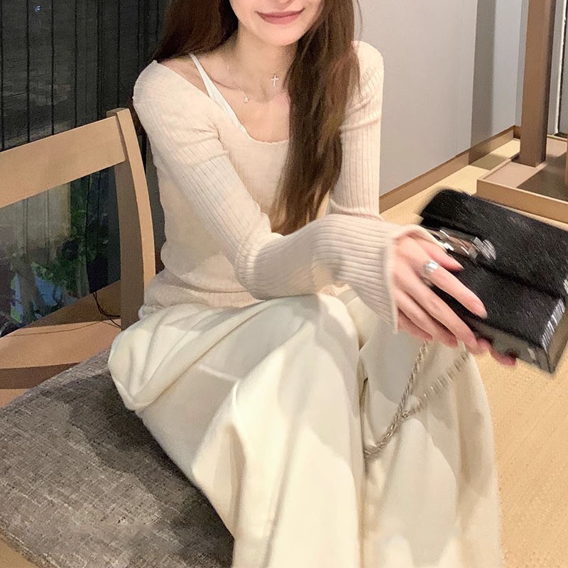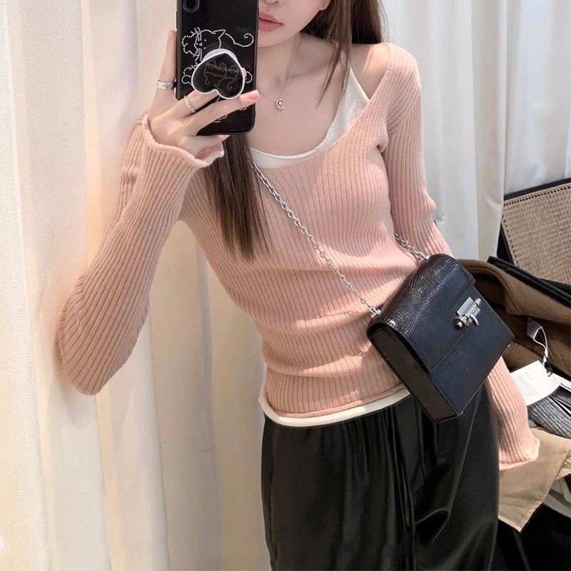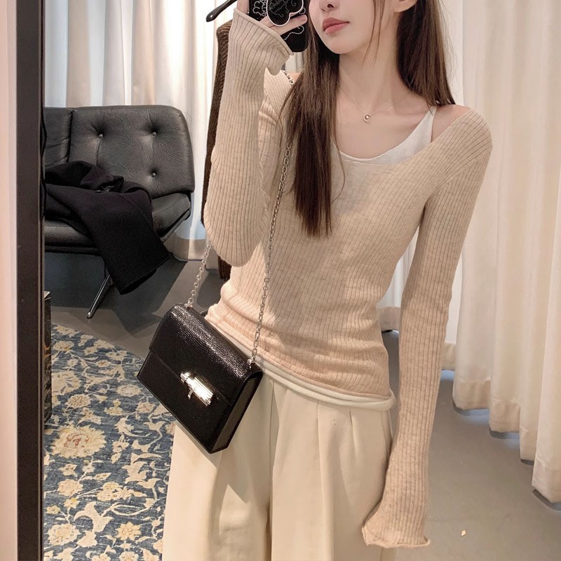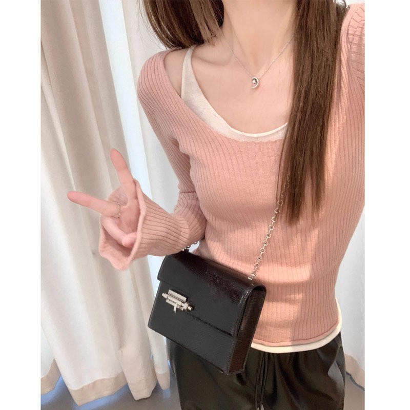 | nameOriginal | Fahua/manmiao lazy line curling double-layer fake two-piece stacked collar bell sleeve stretch bottoming shirt shirt top |