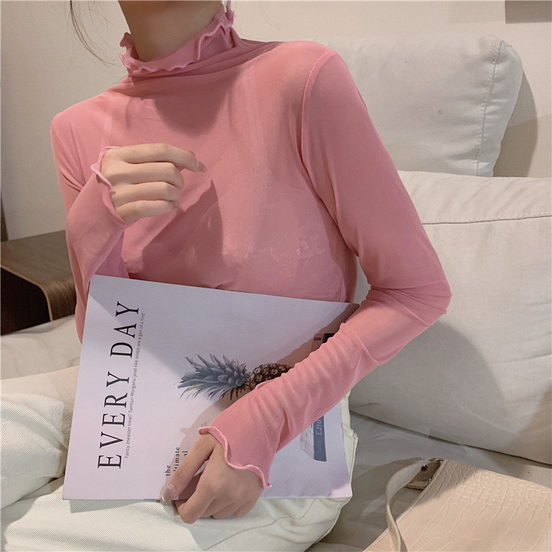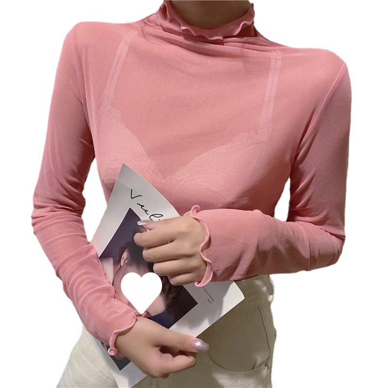 | nameOriginal | Fairy mesh bottoming shirt Women's transparent thin gauze inner long sleeve pink mask sand t turtleneck lace top |