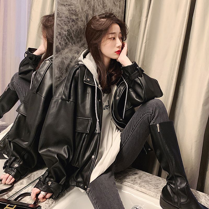 Fake two-piece leather coat for women 2023 new black hooded stitching loose short motorcycle clothing PU leather jacket