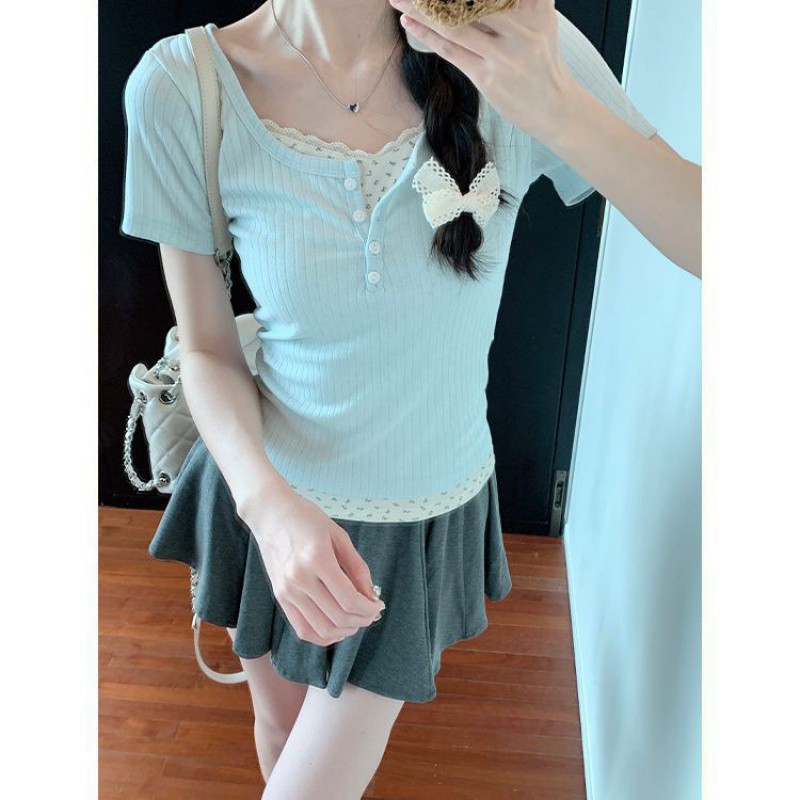 | nameOriginal | Fake Two-piece Pure Floral Short-sleeved Shirt Women's Summer Slim-fit Slimming Fresh Style Hot Girl Stacked Base Shirt Top |
