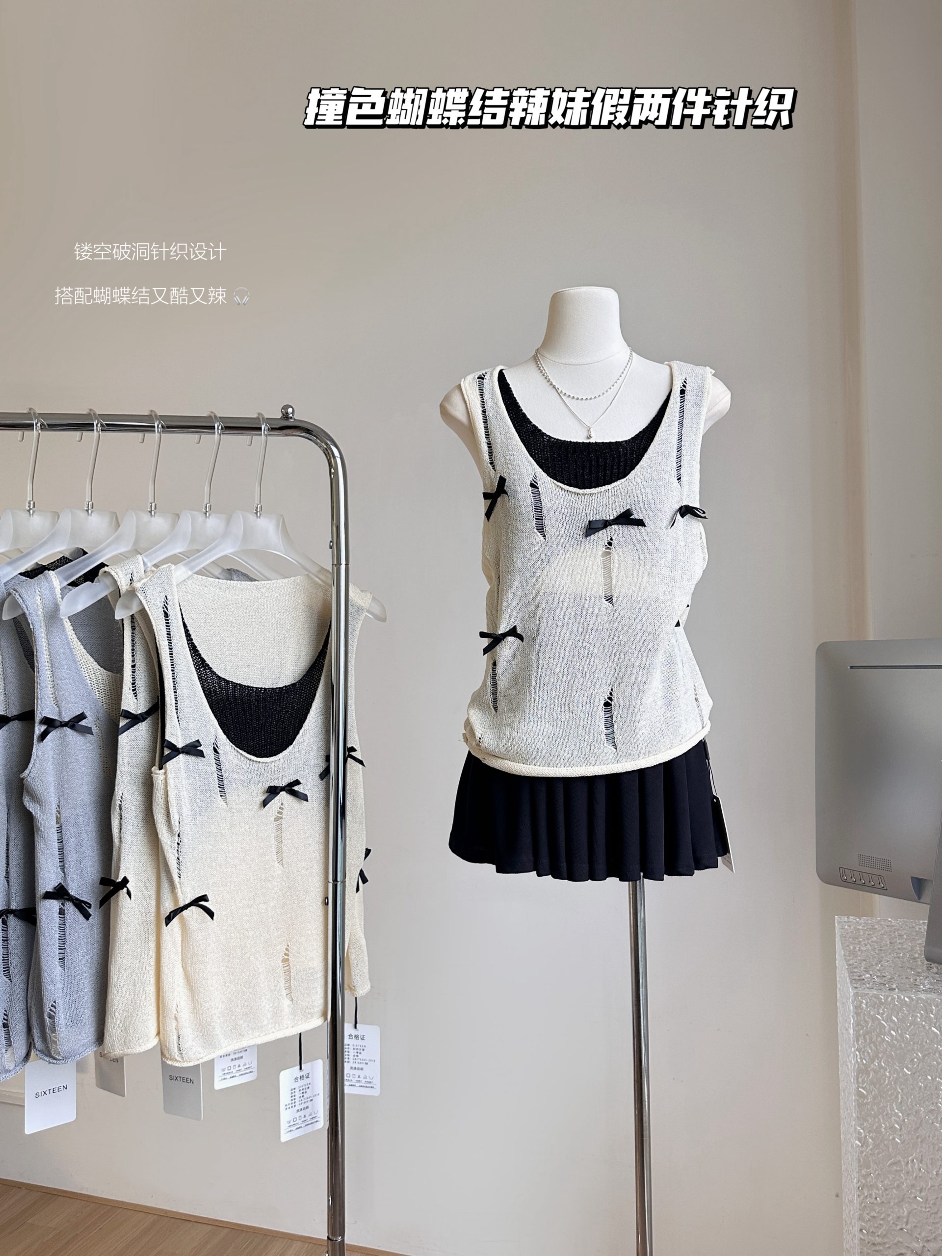 | nameOriginal | Fake two-piece rolled edge ripped knitted top with bow |