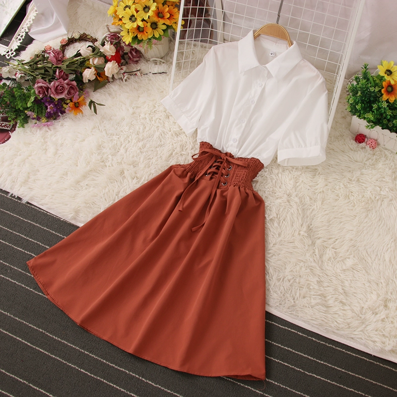 | nameOriginal | Fake two-piece short-sleeved shirt dress, age-reducing design, contrasting color stitching, waist slimming, A-line umbrella skirt, short skirt |