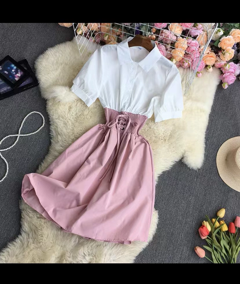 | nameOriginal | Fake two-piece short-sleeved shirt dress, age-reducing design, contrasting color stitching, waist slimming, A-line umbrella skirt, short skirt |
