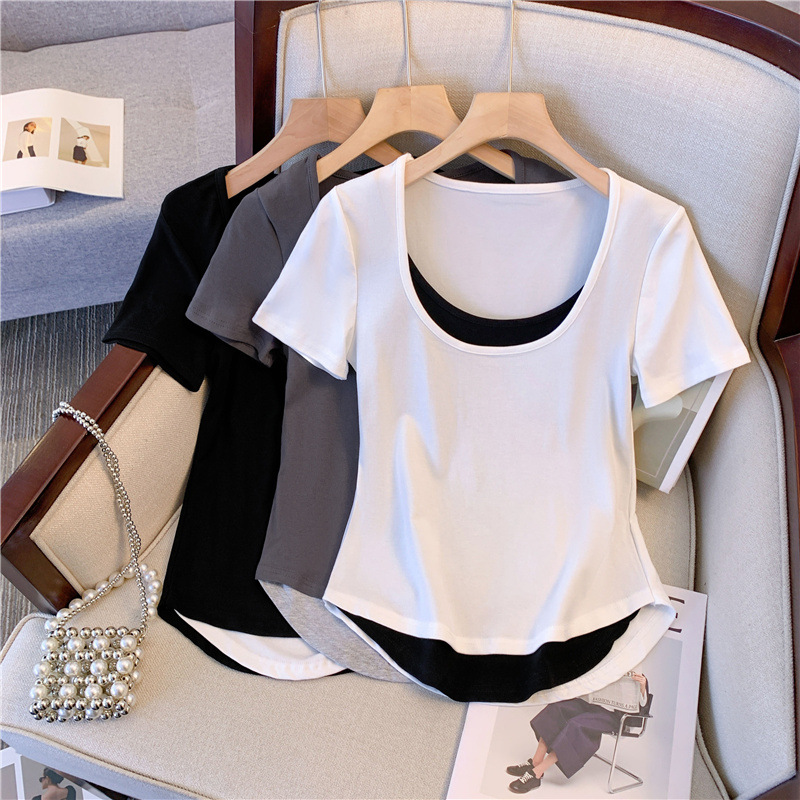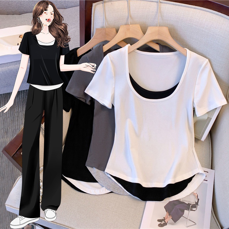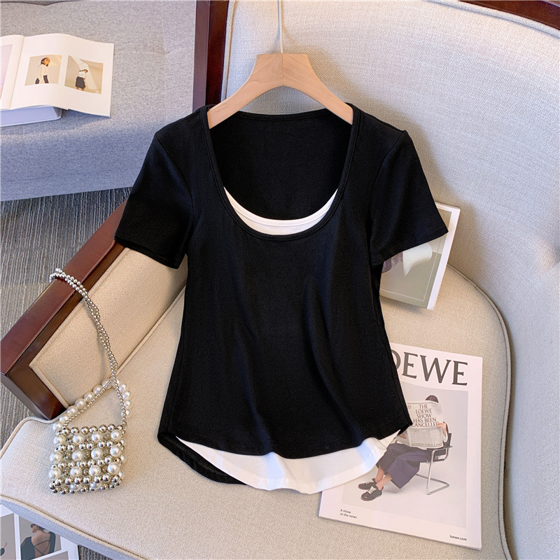 Fake Two-piece Short-sleeved T-shirt 2024 New Women's Shoulder Summer plus size Slight Fat mm Slim Irregular Short Top