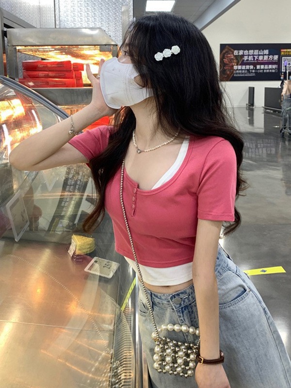 | nameOriginal | Fake Two-piece Short-sleeved T-shirt Women's Summer 2024 New Design Sense Korean Style Slim-fit Slim-fit Short Cropped Top Ins |