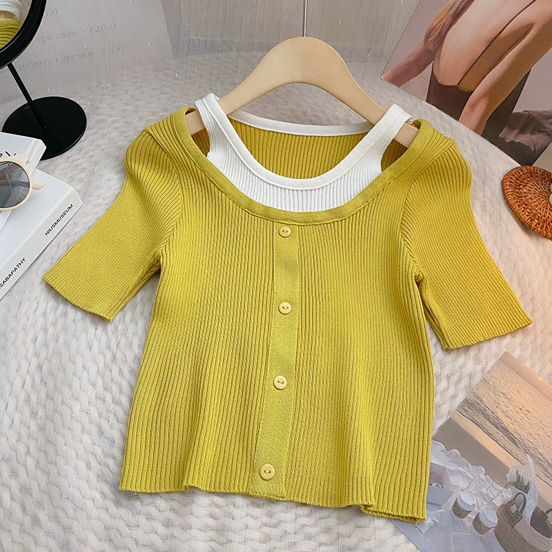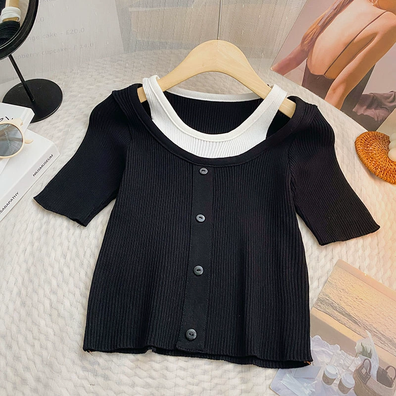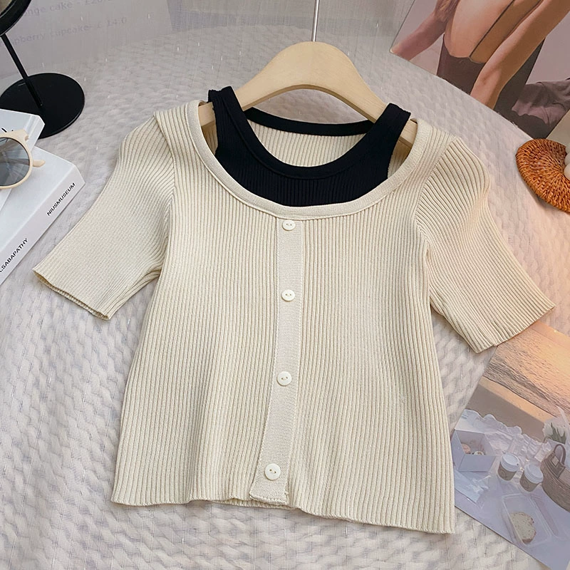 | nameOriginal | Fake two-piece spliced short-sleeved sweater for women summer 2023 new Korean version retro slimming short top |