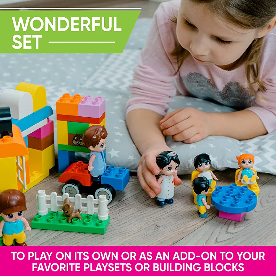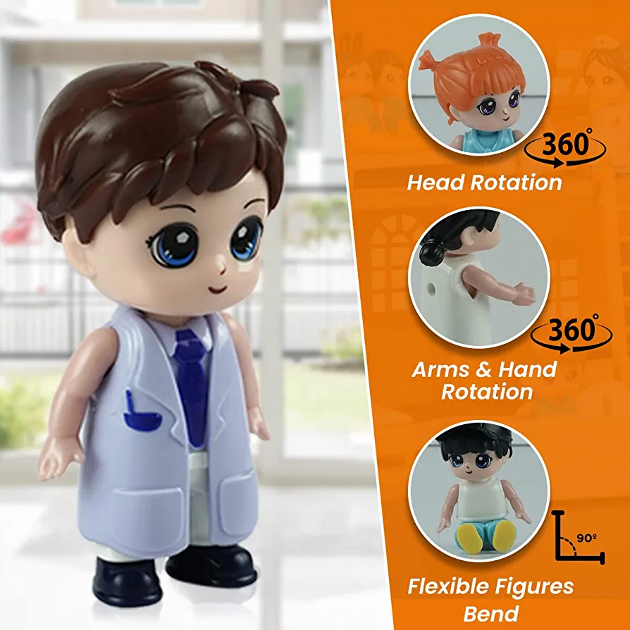 This is a complete set of family figurines that includes parents, four kids, a doctor, a nurse, and a small puppy dog. The figures are the perfect size for small hands, with the parents and medical professionals measuring 3 inches, the kids measuring 2.2 inches, and the puppy dog measuring 1.5 inches. All figures have movable hands and heads, and the kids’ figures also have movable legs for added playability. These realistic and detailed figures are perfect for use in dollhouses, farm toys, and building playsets. They are also super durable and have been safety tested to meet American and EU standards. Packaged in a beautiful colored box, this set makes an amazing gift for children.