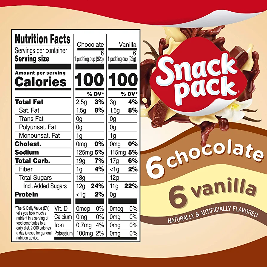 | nameOriginal | Snack Pack Chocolate and Vanilla Pudding Cups Family Pack, 12 Count (Pack of 1) |