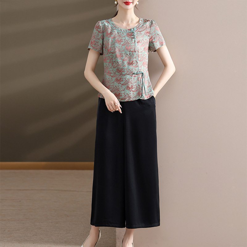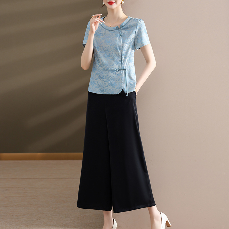 Fashion Casual suit Women's 2024 Summer New National Style Round Neck Buckle Chiffon Small Shirt Wide-leg Pants Two-piece Set Trendy