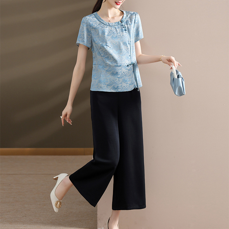 Fashion Casual suit Women’s 2024 Summer New National Style Round Neck Buckle Chiffon Small Shirt Wide-leg Pants Two-piece Set Trendy